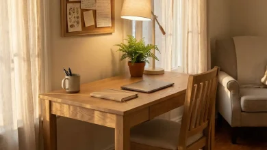 This corner desk embodies a traditional charm with its muted colors and classic furniture styling. Yet, it doesn’t shy away from a modern touch, evident in the sleek desktop items and the contemporary art that graces the wall. This desk could seamlessly blend into a stately library or offer a serious yet stylish corner in a small living space. It’s a perfect fusion of old and new, creating an aesthetic that feels both timeless and 2025.