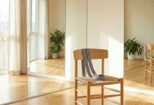 Amidst the expanse of a serene room, a mustard yellow chair holds court, its sleek lines and minimalist design echoing the mid-century modern aesthetic. This chair isn’t just a piece of furniture; it’s a statement of modern sophistication. Paired with a rustic wooden table and a richly patterned rug, it invites a sense of styling that bridges decades. The warm tones of the chair and the intricate designs on the rug provide endless ideas for a living room makeover, blending modern sensibilities with timeless appeal.