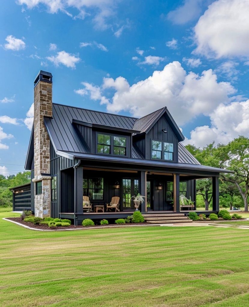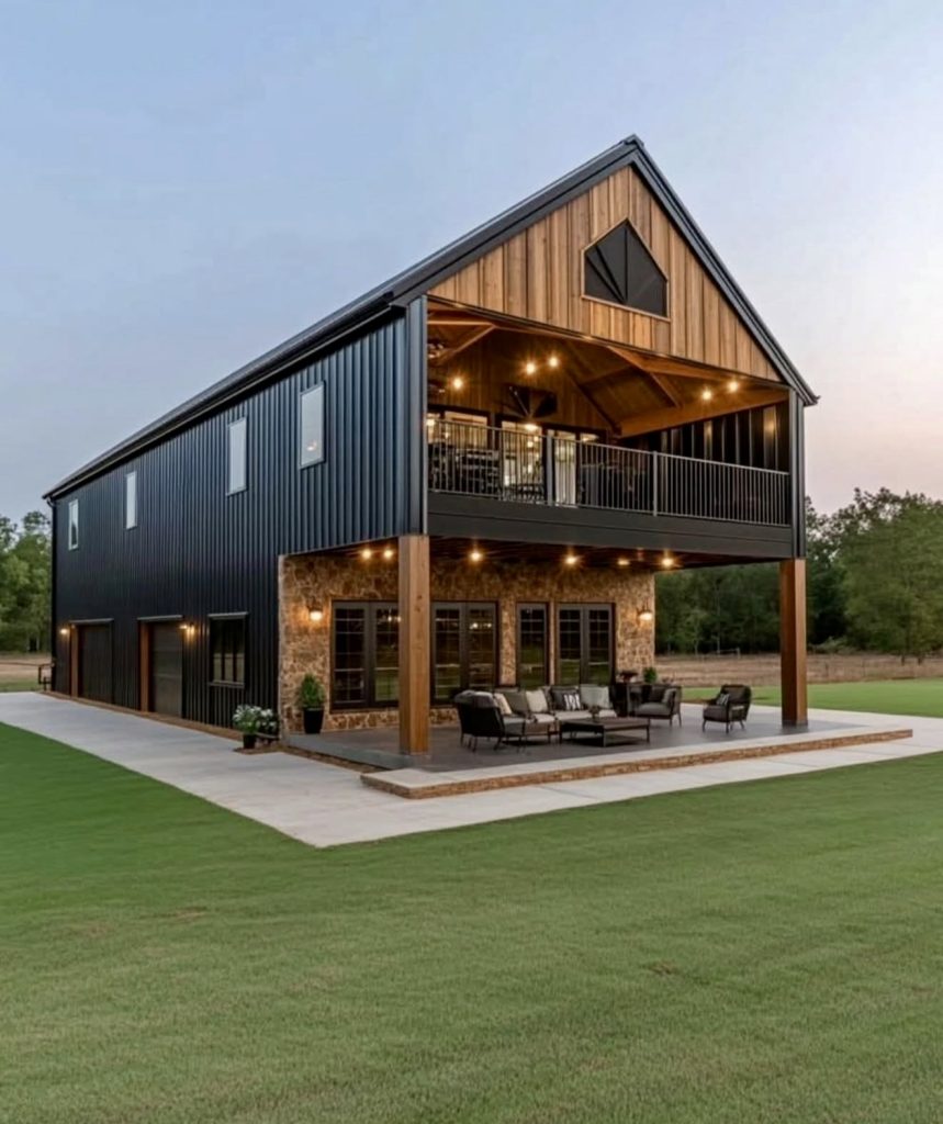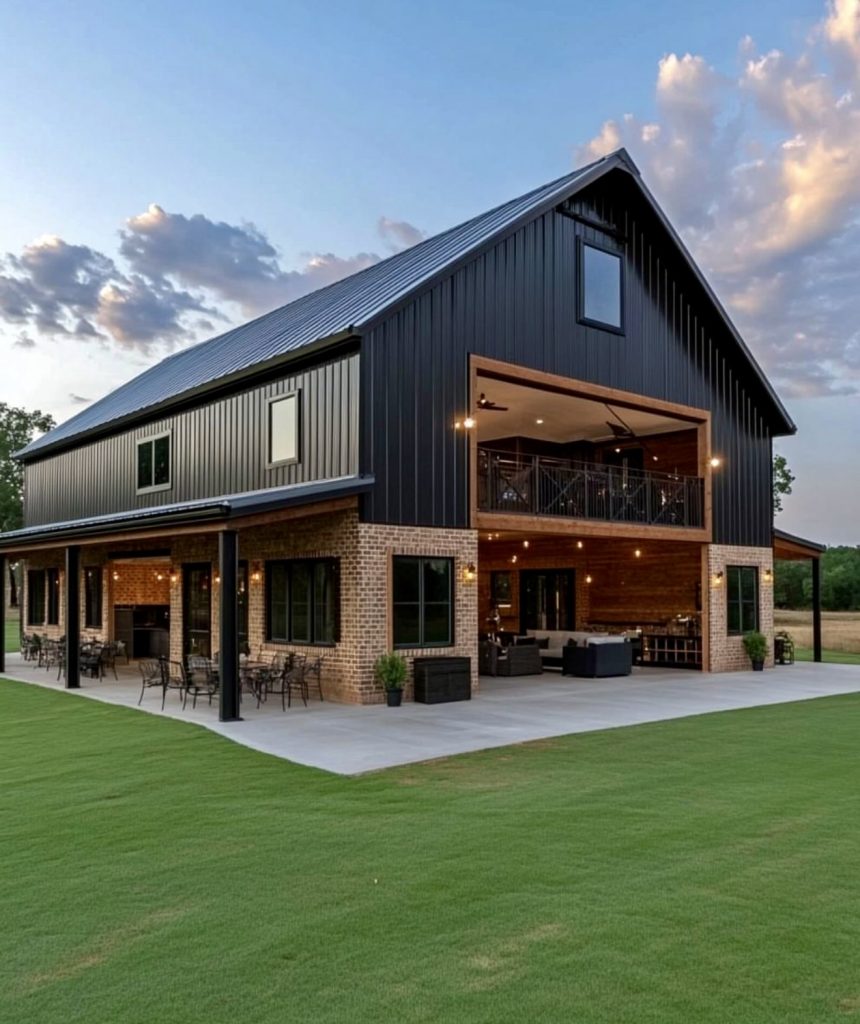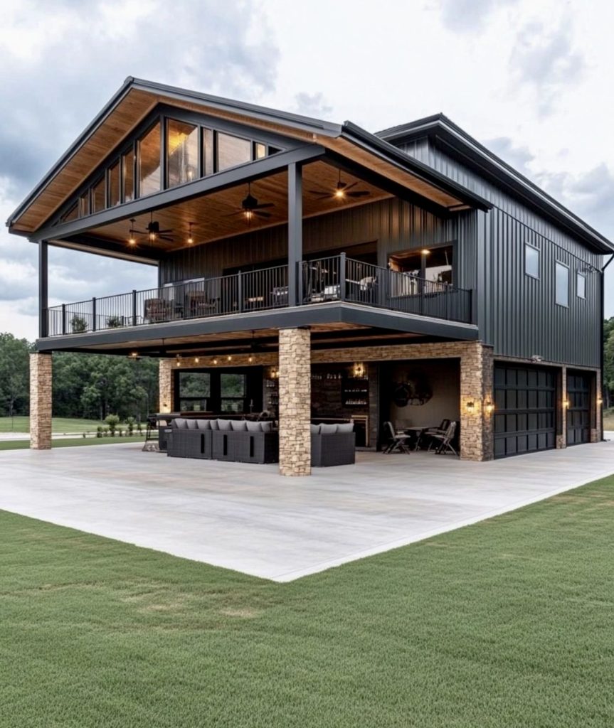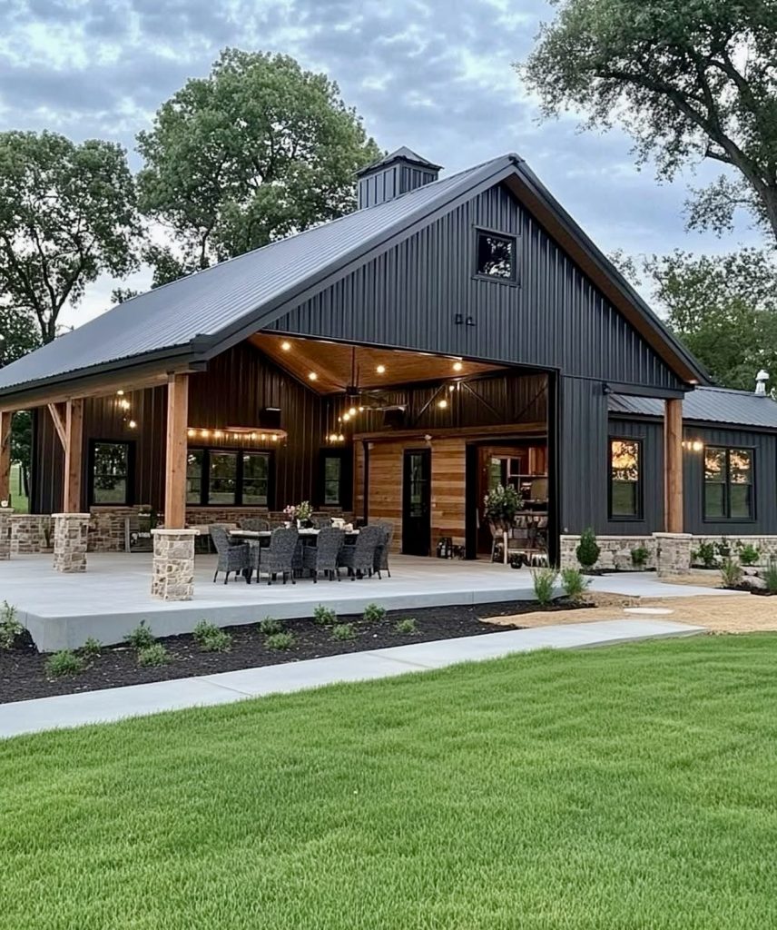 This barndominium shows how ideas exterior can completely transform the way a home feels. The bold black siding creates a strong visual impact, while the spacious covered patio offers room for dining and social gatherings. Its design demonstrates how plans can merge indoor and outdoor living, giving homeowners more flexibility. The stone accents and wooden beams add warmth, grounding the modern style in natural materials. It’s a great example of ideas floor plans designed for those who love to host family and friends.