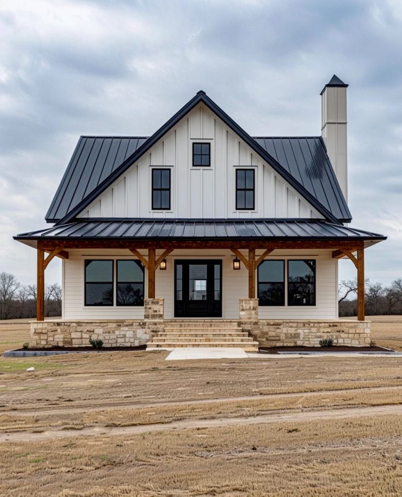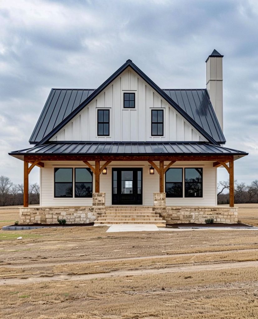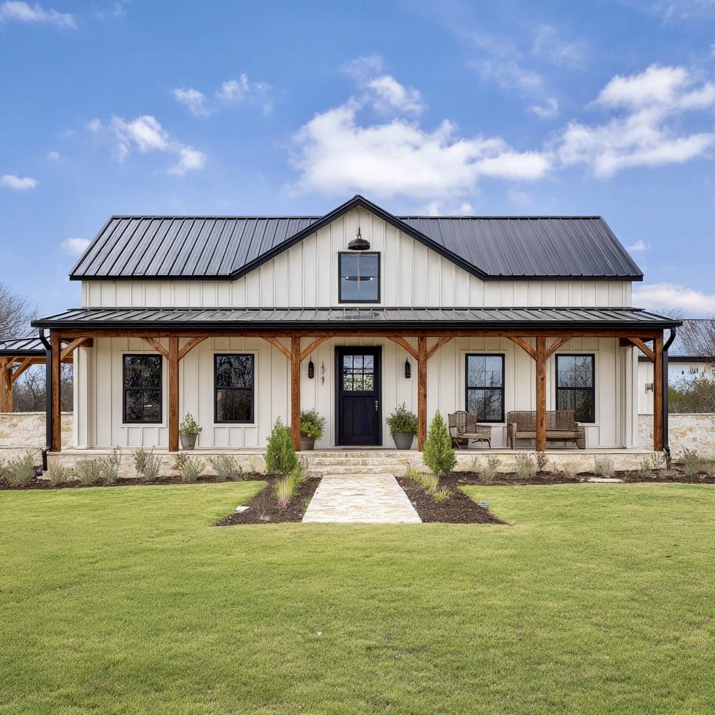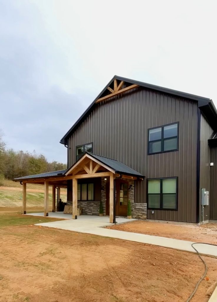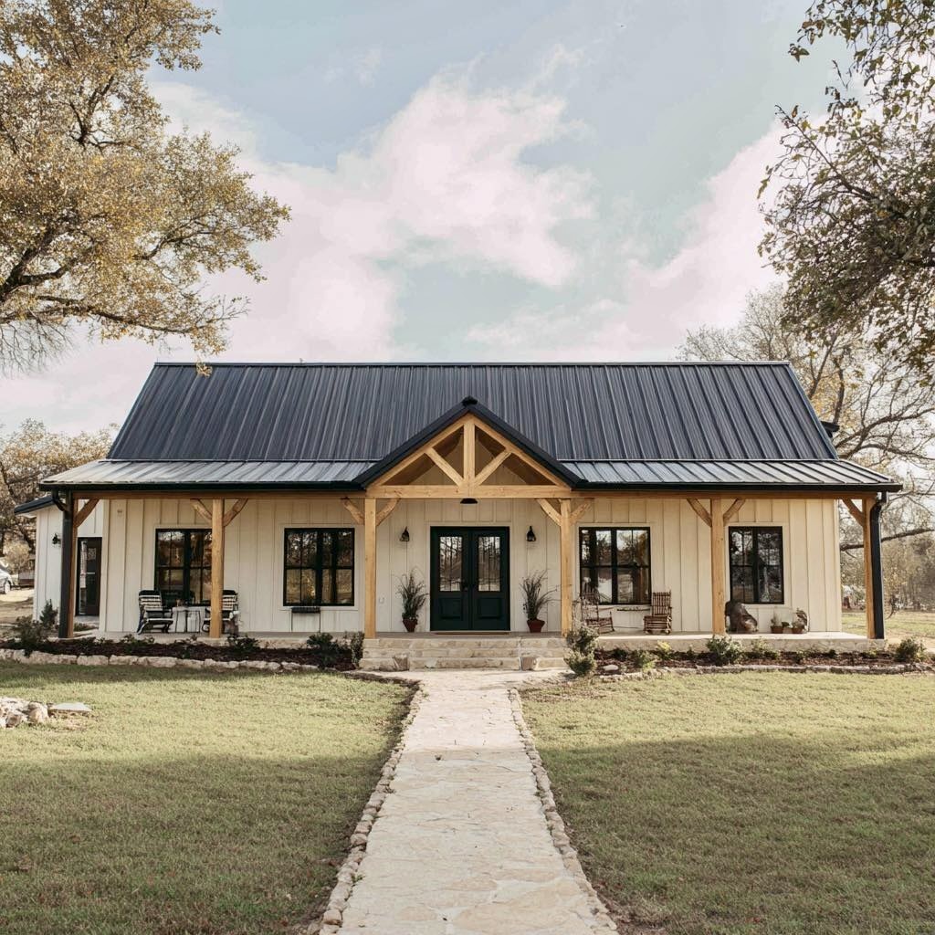 This barndominium shows how ideas exterior can completely transform the way a home feels. The bold black siding creates a strong visual impact, while the spacious covered patio offers room for dining and social gatherings. Its design demonstrates how plans can merge indoor and outdoor living, giving homeowners more flexibility. The stone accents and wooden beams add warmth, grounding the modern style in natural materials. It’s a great example of ideas floor plans designed for those who love to host family and friends.