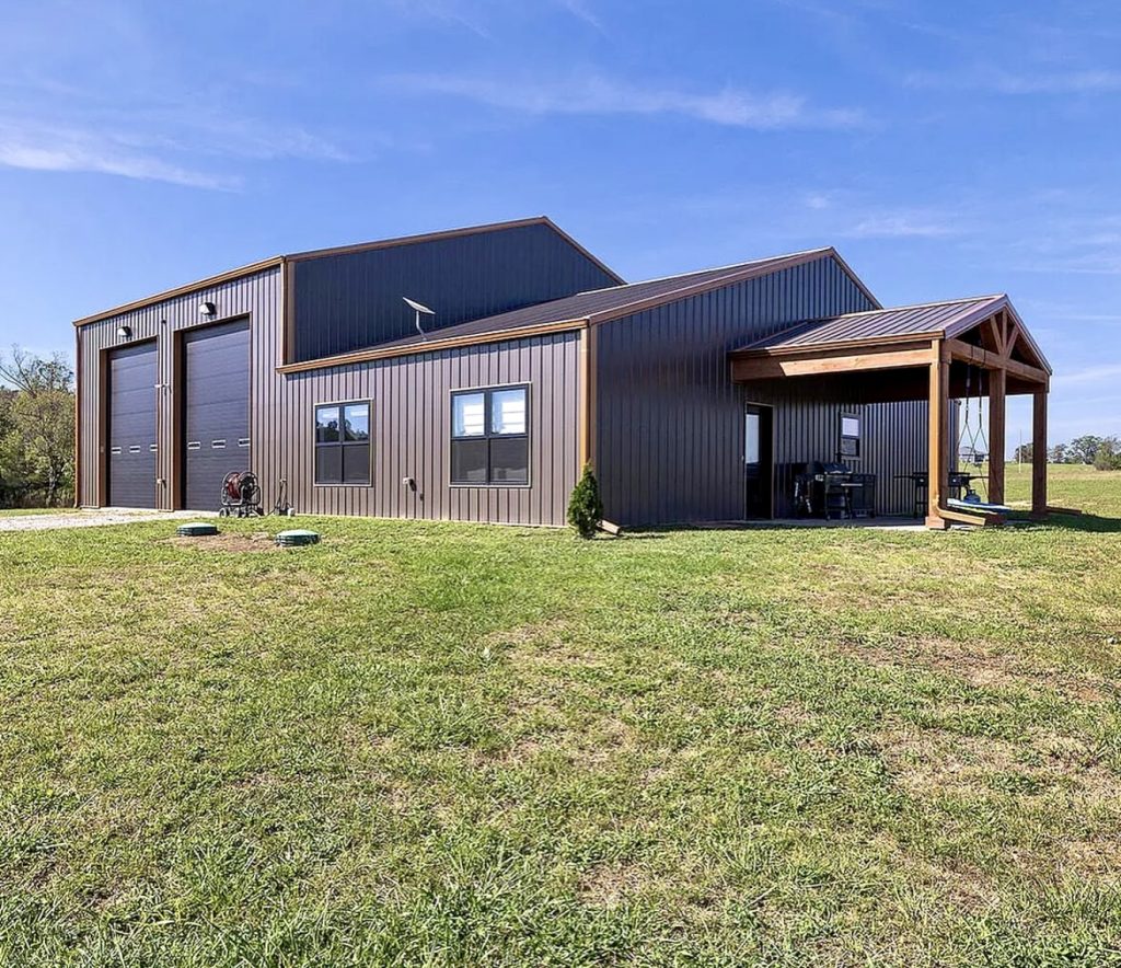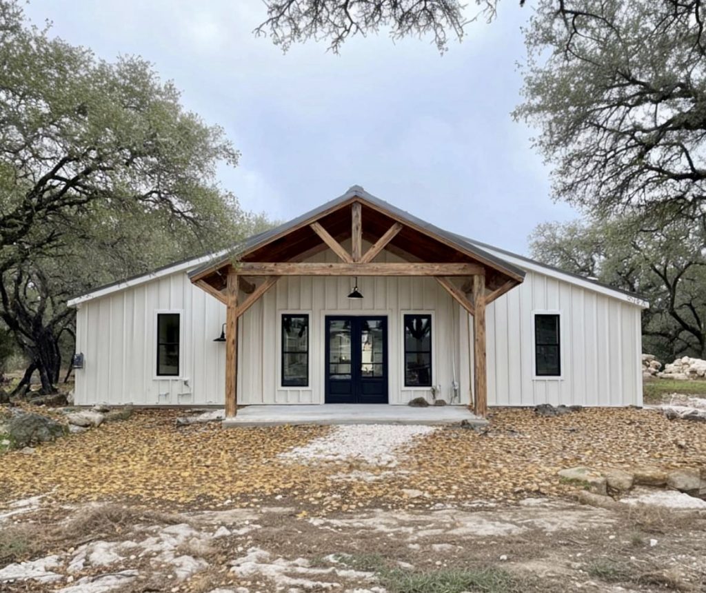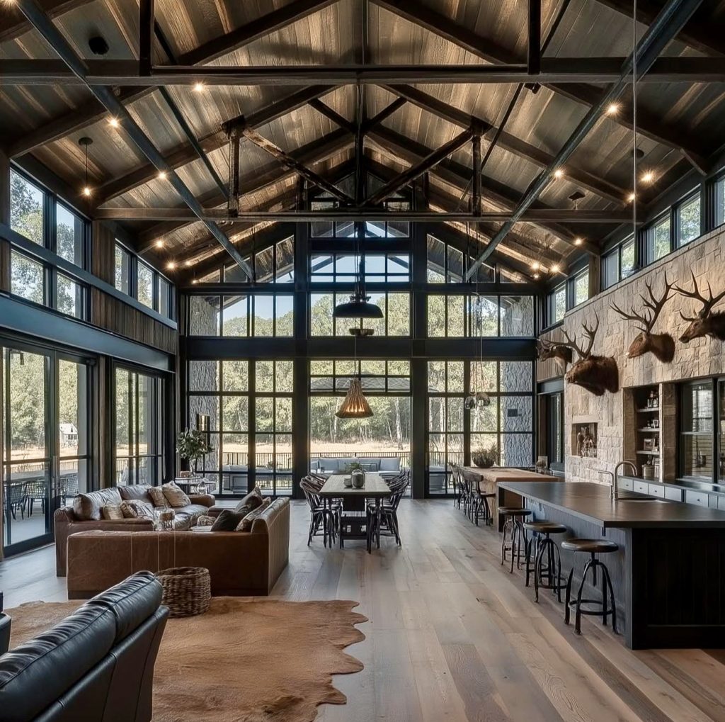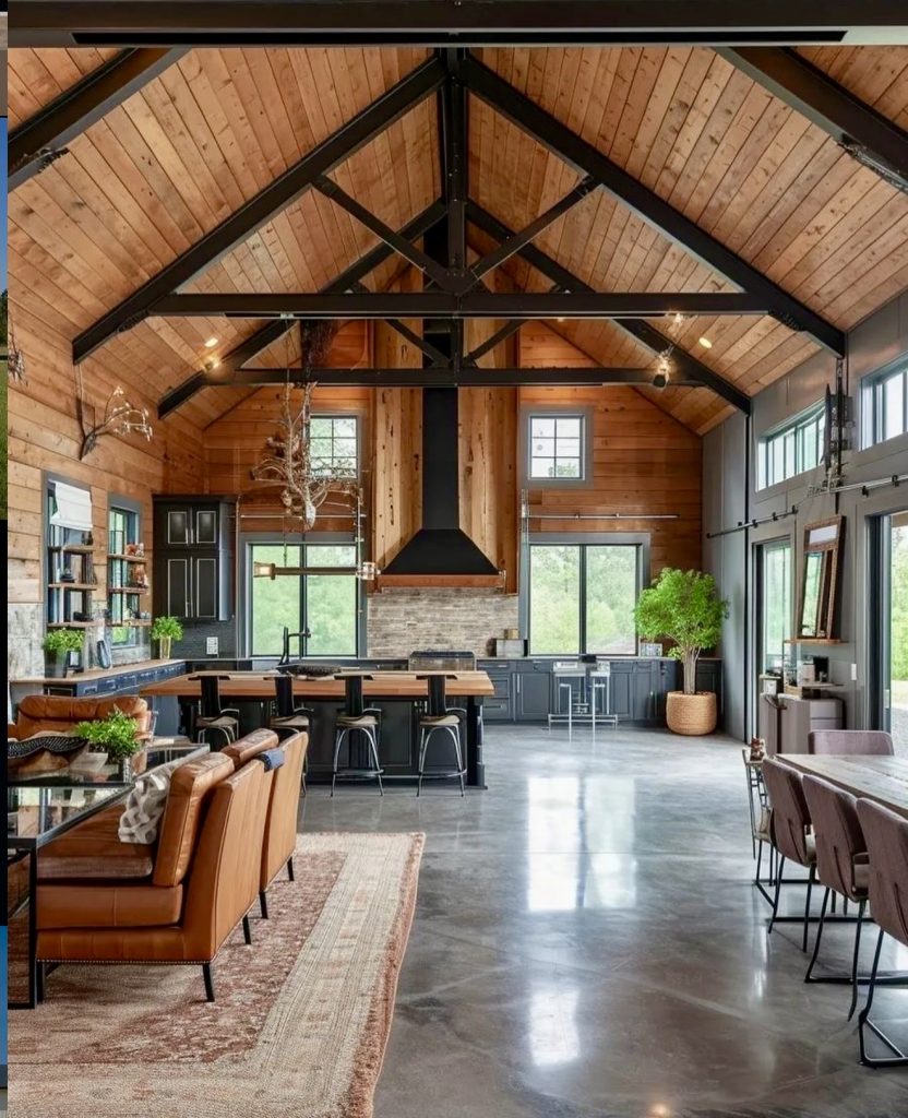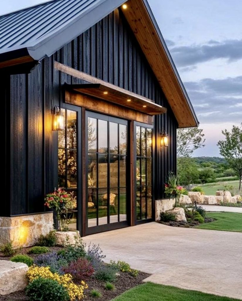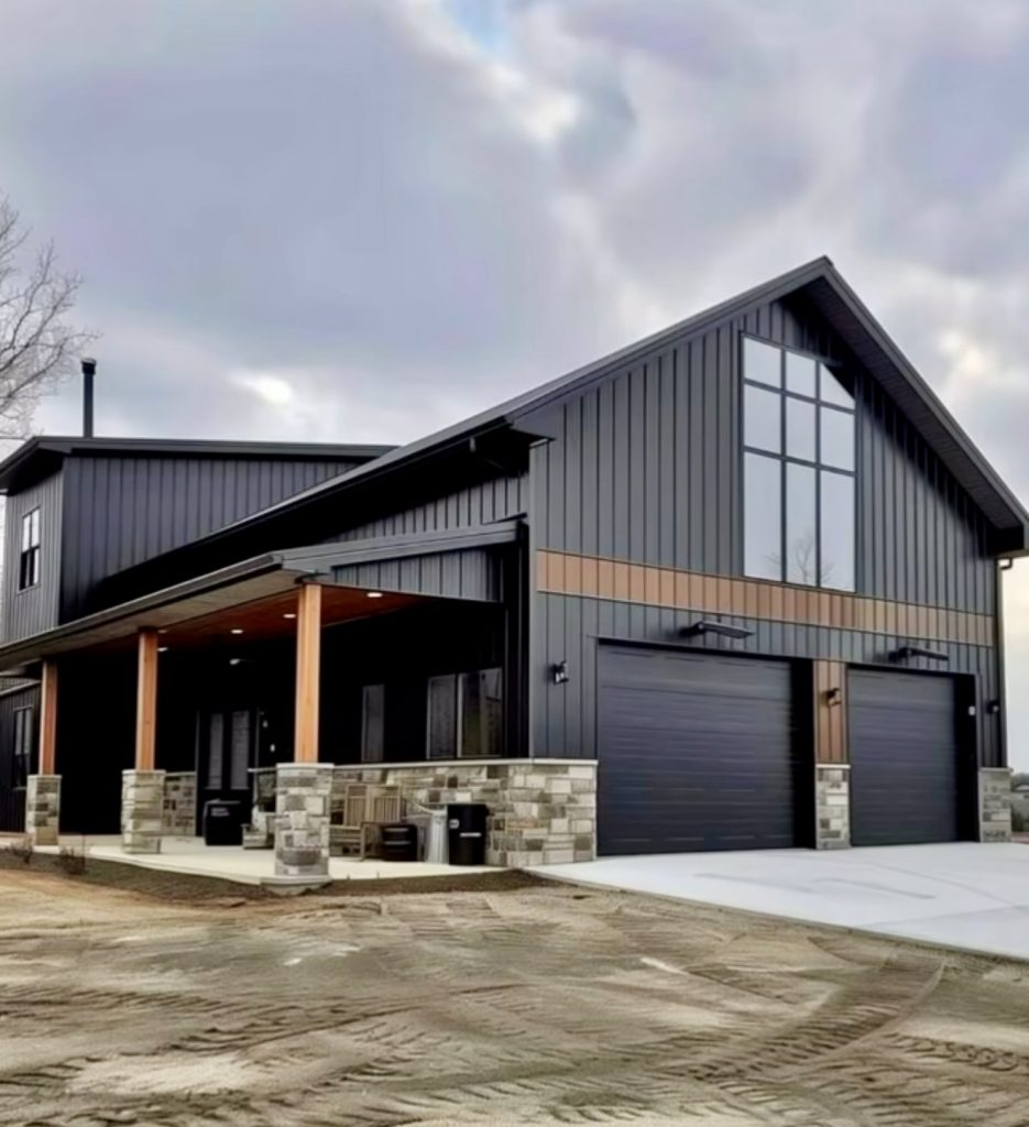 Bold and modern, this barndominium uses a striking black exterior to make a memorable impression. The glass-paneled entry creates a seamless connection between inside and outside, perfect for a shop or mixed-use layout. Designers often pair this kind of façade with luxury interior open floor concepts that highlight natural light. A well-planned kitchen open concept anchors the design, offering both functionality and style. This home shows how ideas floor plans can evolve into creative, versatile solutions that meet modern needs.