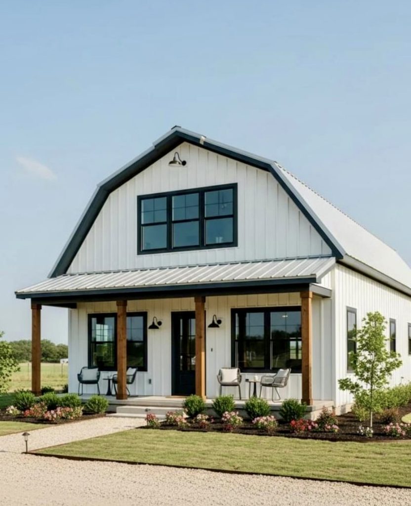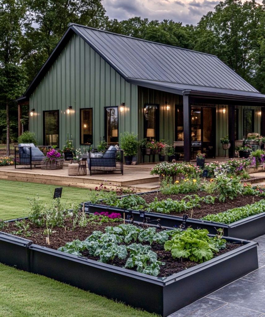This unique barndominium home has approached its design differently by using its muted green exterior that completely combines well with its environment. Raised garden beds add personality and functionality, proving that ideas exterior can enhance not only curb appeal but also daily living. The design is perfect for homeowners who value sustainability and want plans that support a homestead lifestyle. Inside, ideas interiors can reflect the same natural energy with wood finishes and plant-filled living rooms. It’s proof that affordable design choices can still deliver charm and purpose.