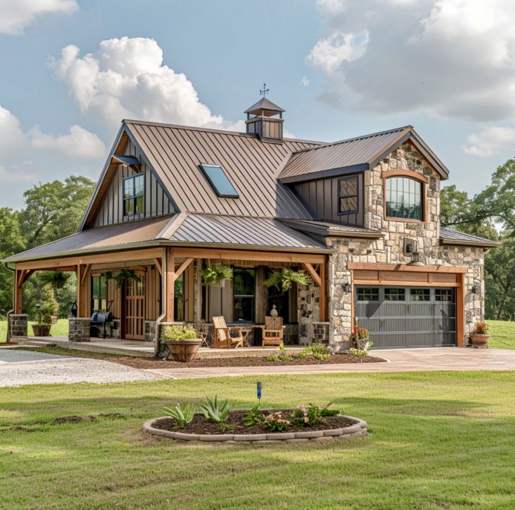 This barndominium combines both stone and metal elements that look both rustic and contemporary at the same time. The use of rustic-stone walls adds longevity, while the darker roof line complements the look. The railing around the home adds to its outdoor functionality, ensuring that ideas exterior can contribute to maximizing home space through functionality. The interior design for such homes will feature a kitchen that has an open concept, along with a considerable amount of space for the living room that matches the majesty found in the exterior design. This is an exemplary example that combines luxury and rustic elements without any flaws.
