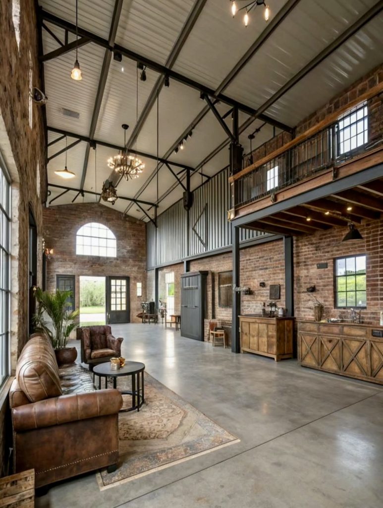 This home displays the industrious aspect of barndominium life with exposed brick and steel. It’s an exemplary illustration that demonstrates unique plans interior to provide unobstructed flow for either entertaining or a comfortable family setting. The combination of leather and wood design ideas for the interior provide functionality combining strength and comfort. This design will prove that it’s possible to create a luxurious setting using affordable materials.