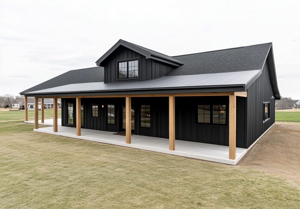6. Entertaining-Friendly Black Barndominium with Covered Patio
