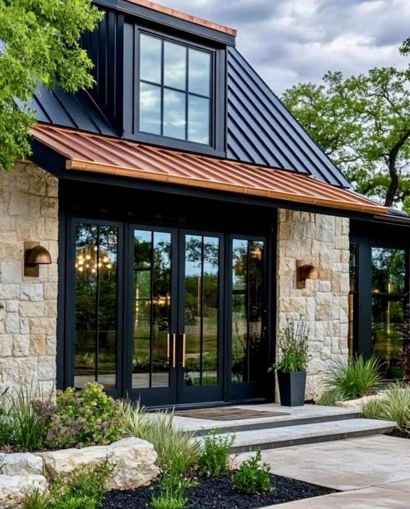 This design improves the home’s aesthetic appeal through the incorporation of stone, black siding, and copper roofs that are eye-catching. The exterior design has a refined look, combining both rustic elements and modern elements. The glass entry doors lead to a brightly lit interior floor, perfect for entertainment and relaxation. Kitchen designs in this image range from luxury elements, similar to that of exterior designs. This design proves that creativity can allow a home to look both timeless and contemporary.