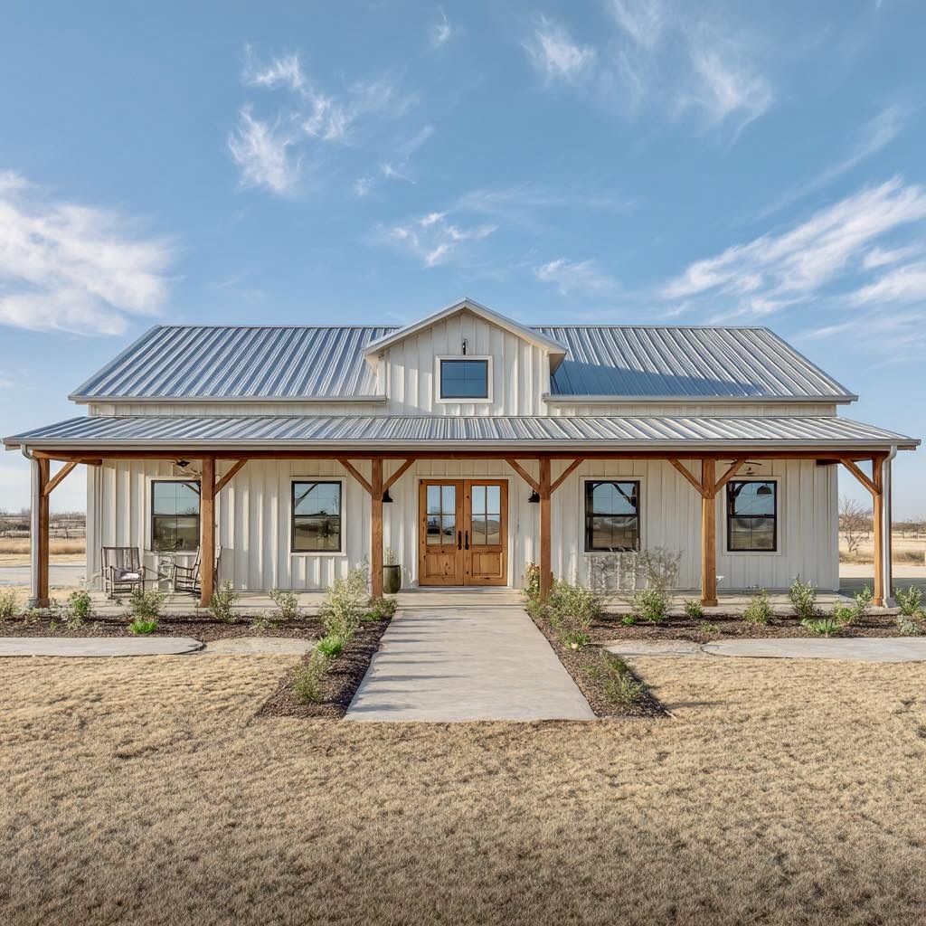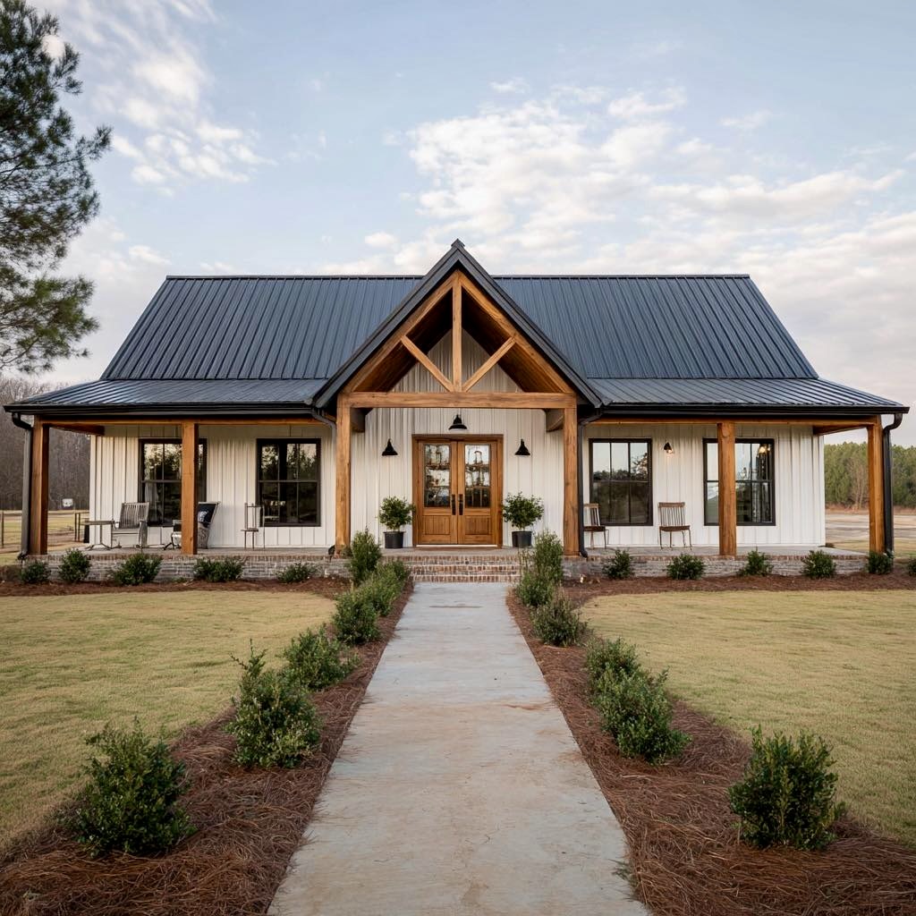 This home embodies the heart of farmhouse living with its white board-and-batten siding and warm wood beams. The welcoming porch creates a comfortable transition between inside and out, perfect for relaxing evenings. Its single story layout emphasizes practical ideas floor plans, making it easy to navigate while feeling spacious. Paired with a kitchen open concept, the flow of the home is both functional and social. For families, this barndominium proves that affordable house plans can still feel like a dream home.