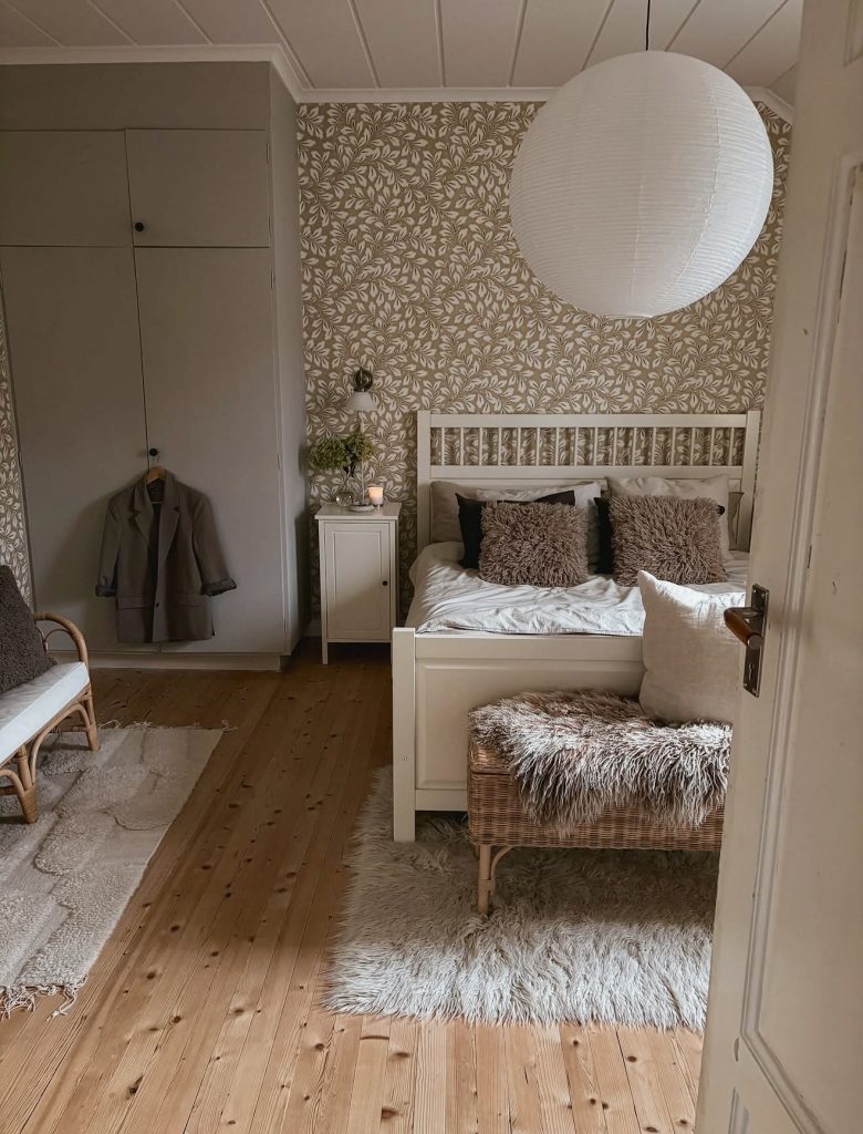 This bedroom blends soft neutrals and layered textures to create an aesthetic cozy environment that suits men wanting warmth without clutter. The light wood floors and subtle leaf-patterned backdrop bring a calm, Scandinavian feel, while the muted bedding and plush textiles make the space feel grounded and mature. It’s the kind of room that works especially well in a small room, offering serenity without feeling overly styled. Details like the faux fur throw and clean-lined furniture show how masculine design in 2026 embraces comfort and simplicity over the traditional bachelor-pad look.
