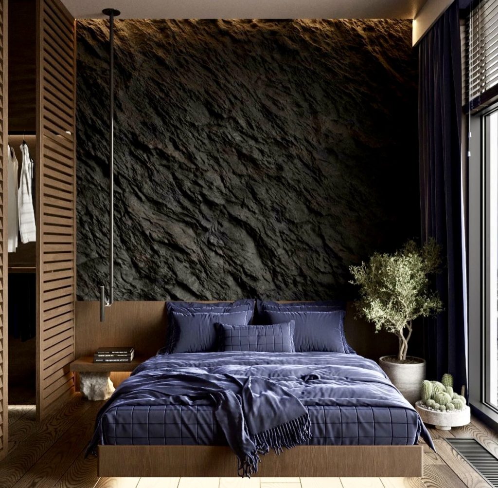 In masculine interiors, stone and wood design combinations are often overlooked, and the addition of industrial design elements is done too dramatically, like in this calm and atmospheric bedroom, which is grounded by the blues of the bedding and was done in a layered and bold way; the contrast of the calming wood and stone blues perfectly neutralizes the bedroom’s powerful look, while the blues and fabrics of the bedding bring coziness and warmth. The warmth of the stones and the layered darkness of the wood’s earthiness create depth and a powerful atmosphere, while the large, dramatic stone headboard adds some rugged character to the bedroom. The wood surrounding the stone fireplace, balancing the temperature of the fireplace stones and the surrounding dominant materials of the headboard, contributes to a contemporary feel without sacrificing a supportive atmosphere. This is a good choice for men who like to prepare their personal spaces in a moody but inviting and calm aesthetic.