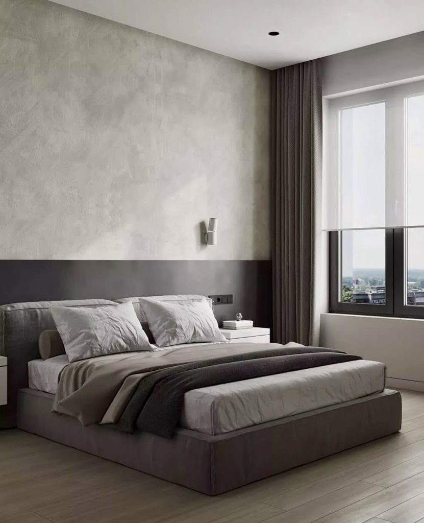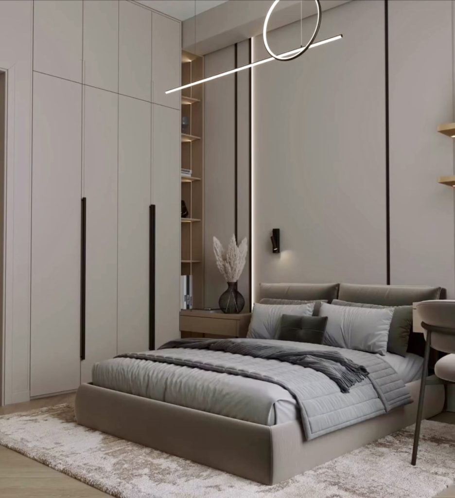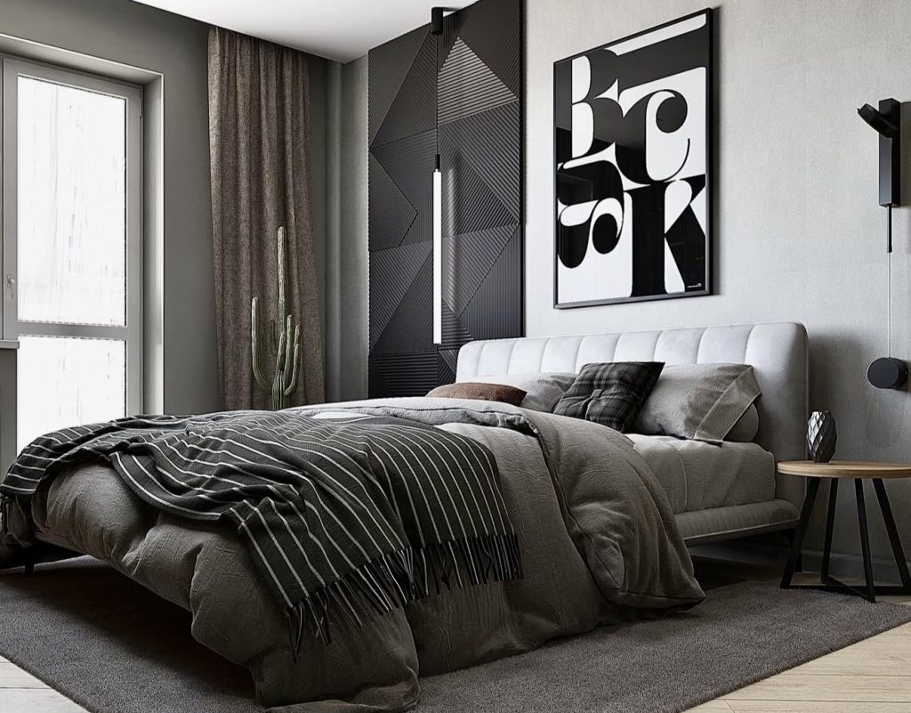 This bedroom uses grey tones as a base and introduces graphic black-and-white artwork to create a sharp, modern look that feels fresh and expressive. The textured feature wall adds a sculptural dimension, while the plush bedding and throw blanket keep the room comfortable and approachable. This balance of strong visuals and soft materials makes the design ideal for men who want a space that feels creatively charged yet calm enough to unwind in—a great match for apartments or compact layouts.