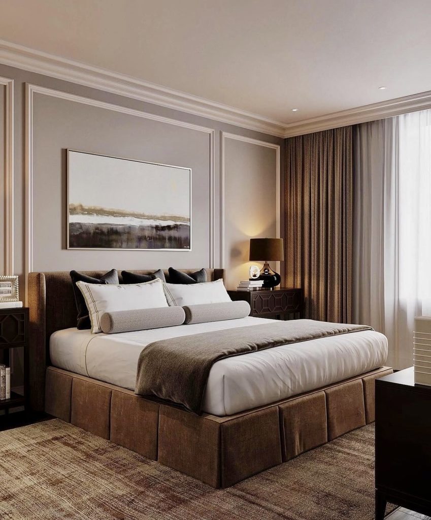 This room manages to channel the ambiance of an upmarket boutique hotel thanks to the warm brown upholstery, the soft, plush bedding, and the elegant molding. The tonal details and the symmetrical layout pull together a sophisticated design with a soft, formal style, making it perfect for someone who prefers the more polished and refined aesthetics without any overly dark tones. The multi-layered designs of the carpeting and the drapery in the rest of the room provide comfort and depth, finishing off a curated and timeless retreat.