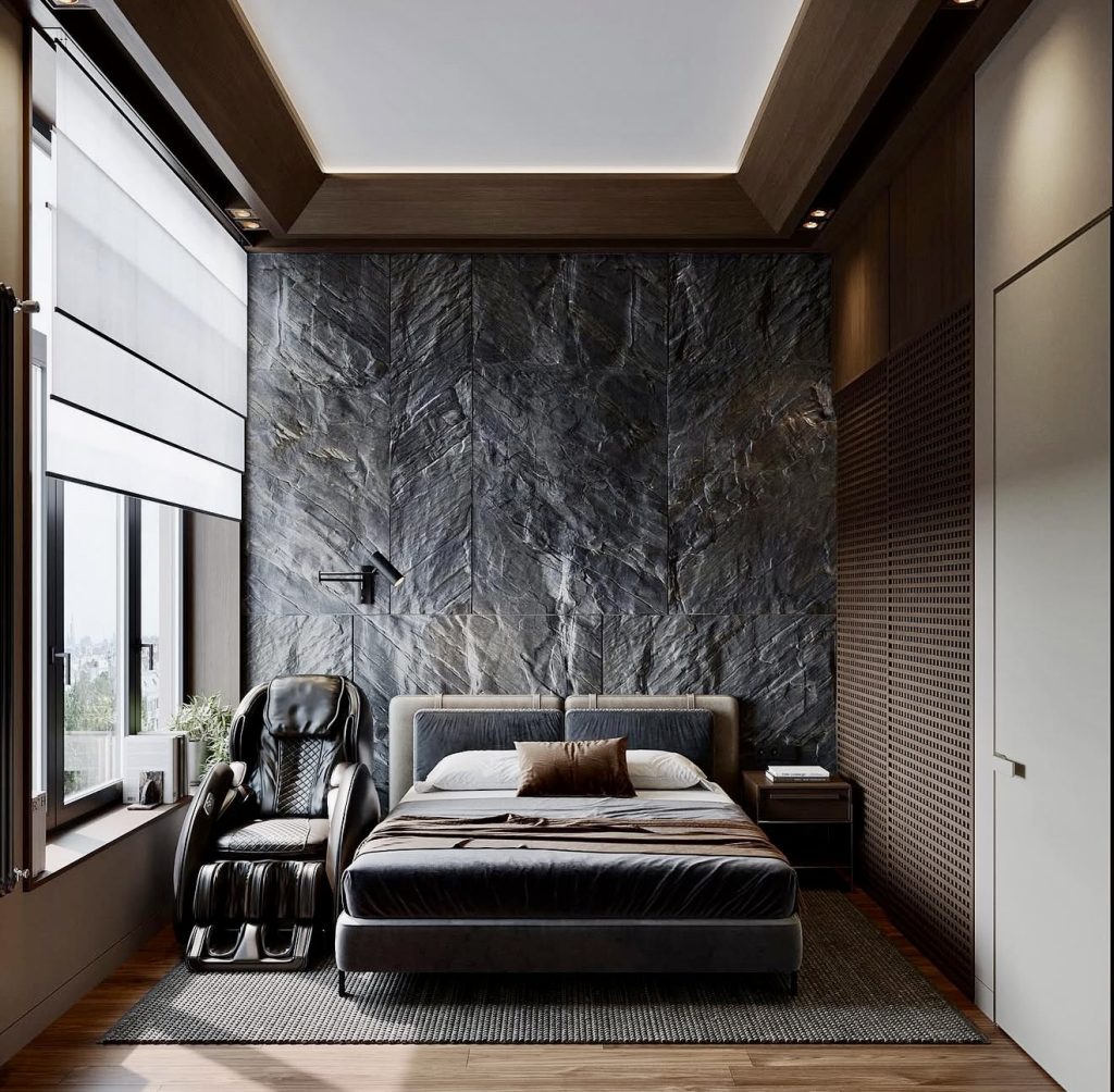 This bedroom embraces bold, masculine energy through its dramatic stone feature wall and sleek, structured furnishings. The rich dark tones, combined with natural textures, create a powerful visual impact while still staying warm and inviting. The massage chair adds a lived-in, personal touch, reminding us that good design should also support real daily life. With elements of dark grey, wood flooring, and soft lighting, this room offers an elevated take on contemporary comfort—ideal for men who favor a statement space with character.