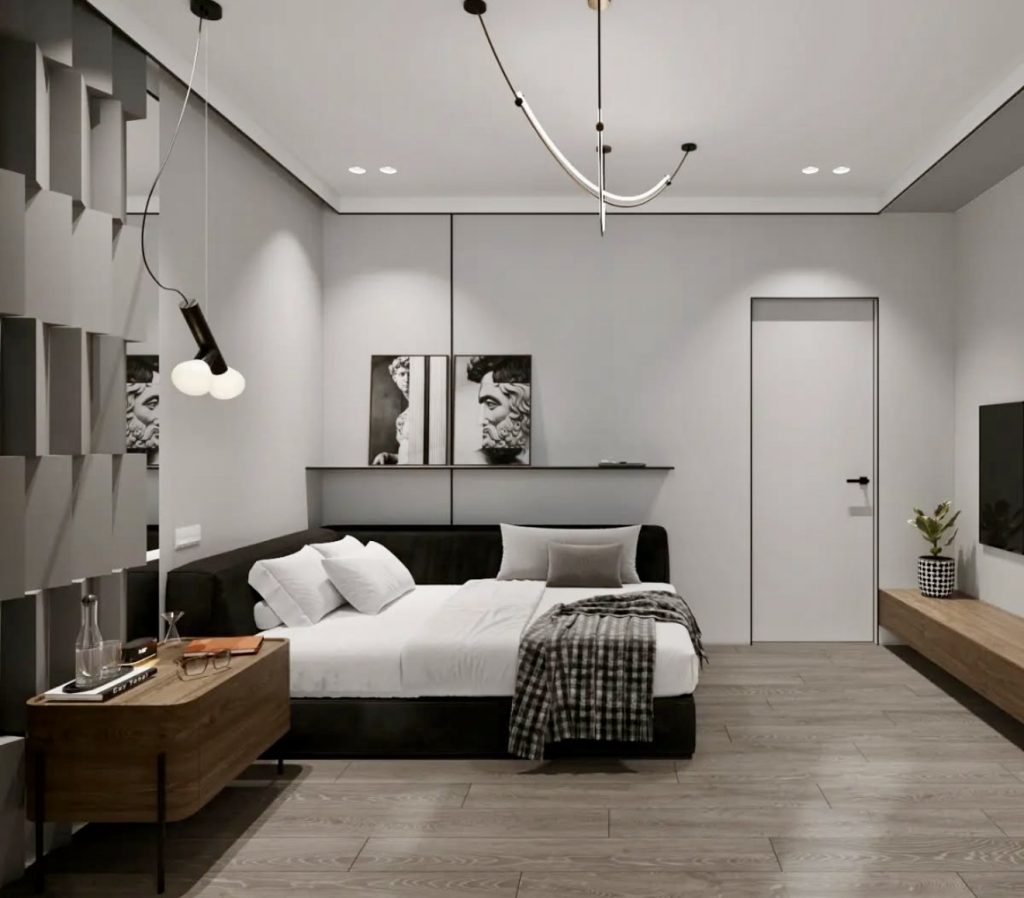 This design leans into a modern monochrome palette where grey, black, and white tones work together to create a crisp, contemporary look that feels perfect for young professionals or design-savvy renters. The geometric accent wall and sleek pendant lighting add sculptural interest, while the low-profile furniture keeps the layout clean and functional. The subtle textures prevent the room from feeling flat, achieving a balance that feels smart, masculine, and effortlessly stylish—especially in small room layouts.