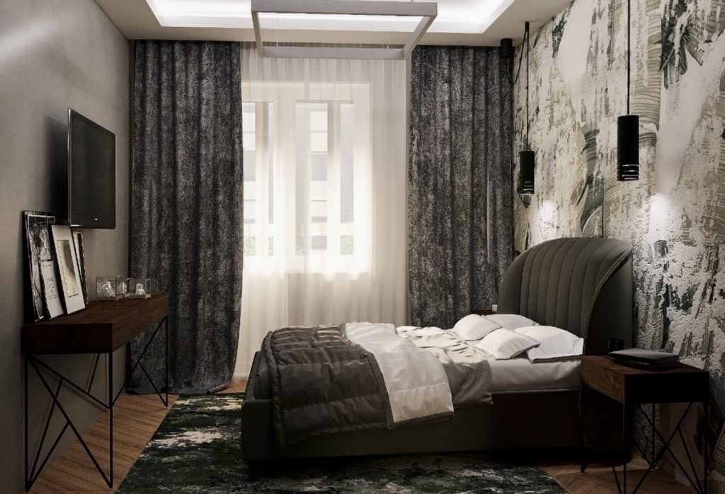 This bedroom stands out through its expressive wall treatment and rich textural layers, which introduce an artistic and slightly moody ambiance. The deep, muted tones carry subtle green and dark undertones, adding personality without overwhelming the space. The combination of patterned curtains, warm wood furniture, and a textured rug brings both comfort and visual interest, making it an excellent choice for men who appreciate a room with character, depth, and an unmistakably aesthetic sensibility.