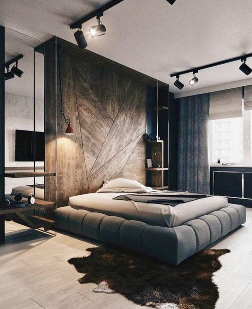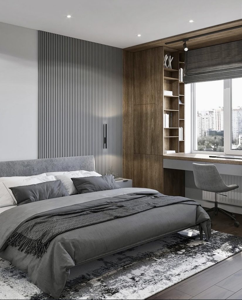 This design shows the fusion of warm wooden and dark grey elements, resulting in a fine junction of bedrooms and focused work zones. Such designs need to be considered by men, as the bedrooms are often the only part of the house where they can have a work zone. The headboard, dark grey bed coverings, and textured walls and added striations, while the built-in desk provides useful contrast. The associated light and dark rug voids the grey, as all grey developments need to have, and provides a fantastic grasp of dynamic when set against plywood.