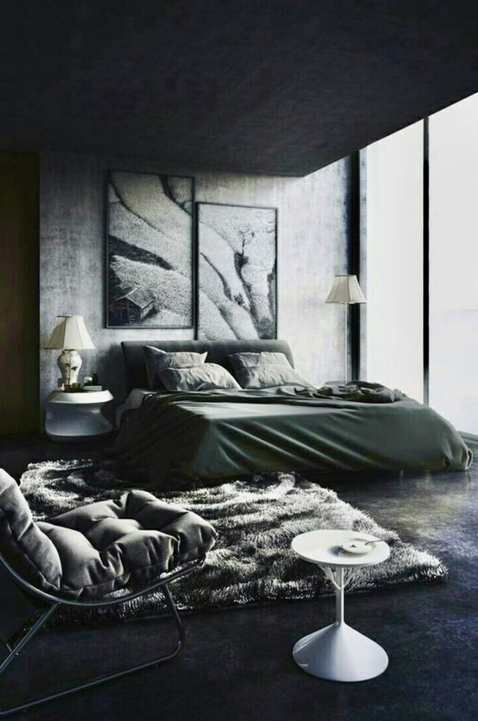 This room embraces the entirety of dark grey and charcoal hues, using them to the fullest in order to create a luxurious cocoon-like atmosphere, which is very dramatic. Softening the color palette are the plush rug and layered bedding, whilst a modern art piece is used to create depth in the area without being too overwhelming. This is ideal for men drawn to closeness in moody spaces. This is a sleeping space that is aesthetically pleasing and minimalist while also providing a great deal of comfort.