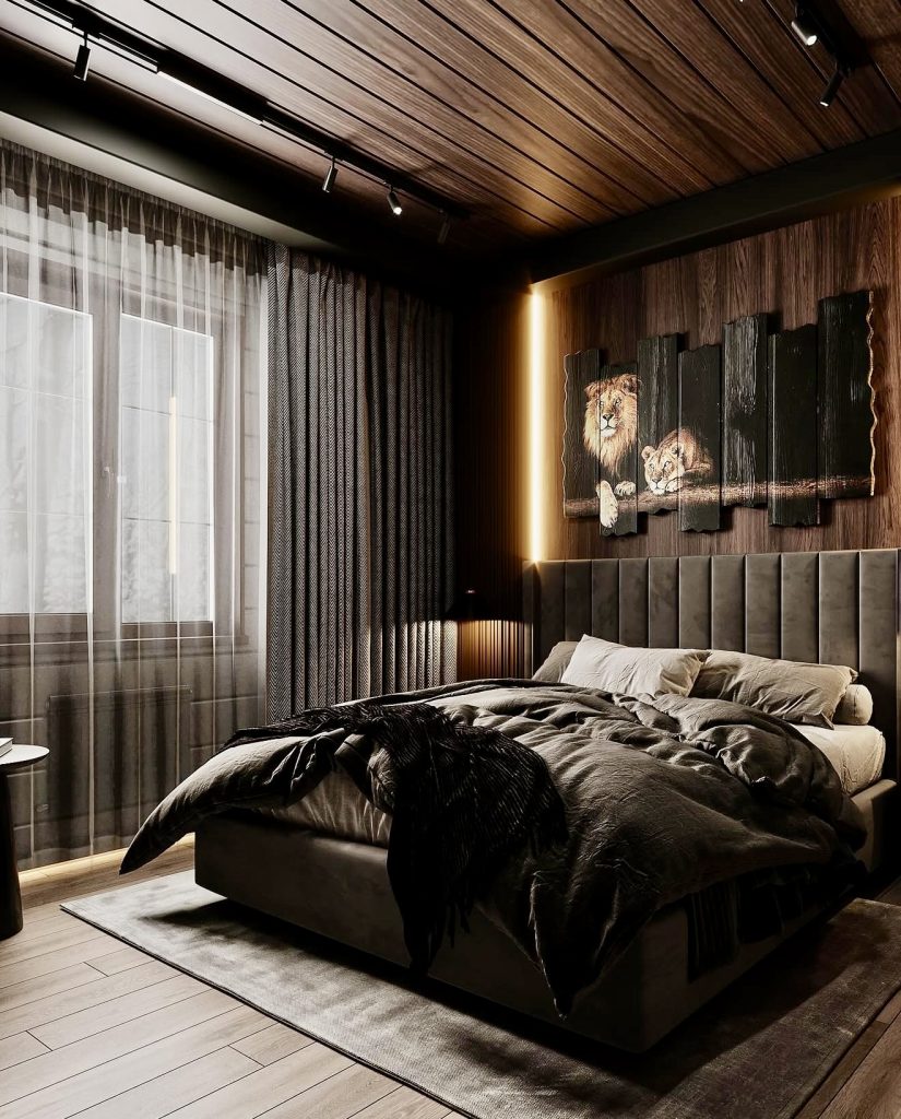 This space combines dim, warm lighting with dark wood elements to create a sanctuary-like bedroom that feels cozy and masculine. The richly textured bedding and upholstered headboard add layers of softness, while the illuminated artwork reinforces the inviting, cocooned feel of the room. This is a great example of how dark palettes can still feel warm and intimate, especially for men who want a bedroom that offers both style and an unmistakable sense of retreat.