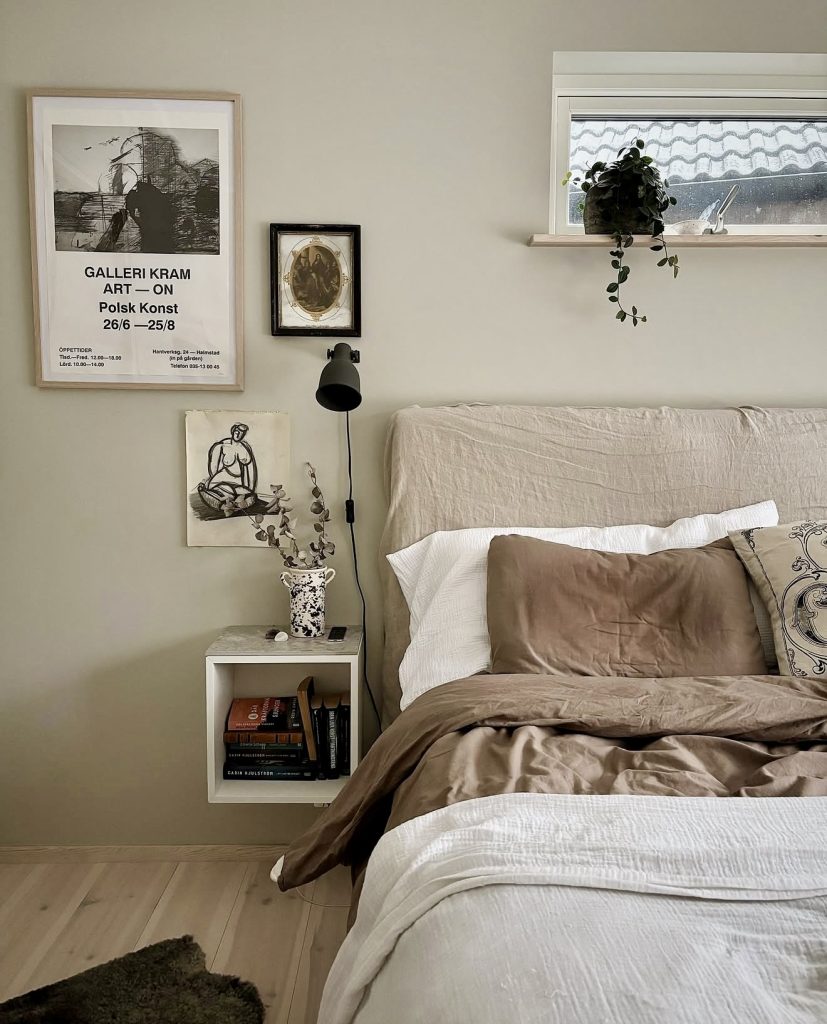 This room uses earthy browns and soft neutrals to create a relaxed setting with understated character, ideal for men who prefer a quieter palette over bold tones like red or blue. The framed sketches and modern wall lamp introduce a creative edge without overwhelming the calm environment, making the space feel lived-in and personal. The floating nightstand keeps the layout light—perfect for apartments where floor space matters—while the gentle color palette supports a grounded, introspective mood that still feels stylish and modern.