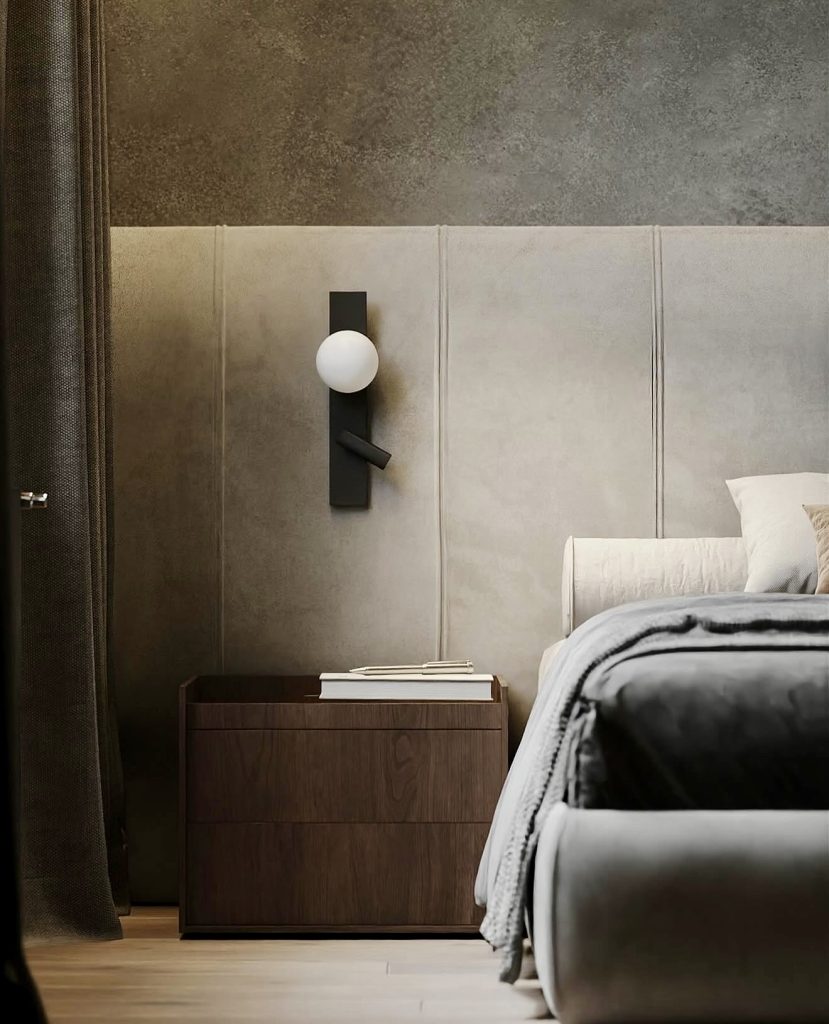 This bedroom showcases how a gentle neutral palette can still feel masculine when paired with rich textures and modern lighting. The combination of soft taupe upholstery, clean-lined furniture, and subtle wood accents creates a space that’s serene without being plain. The wall-mounted sconce adds a sculptural touch, making the room feel quietly sophisticated. It’s a perfect example of how minimal design can support a warm, lived-in atmosphere—ideal for men who appreciate subtle luxury over bold statement pieces.