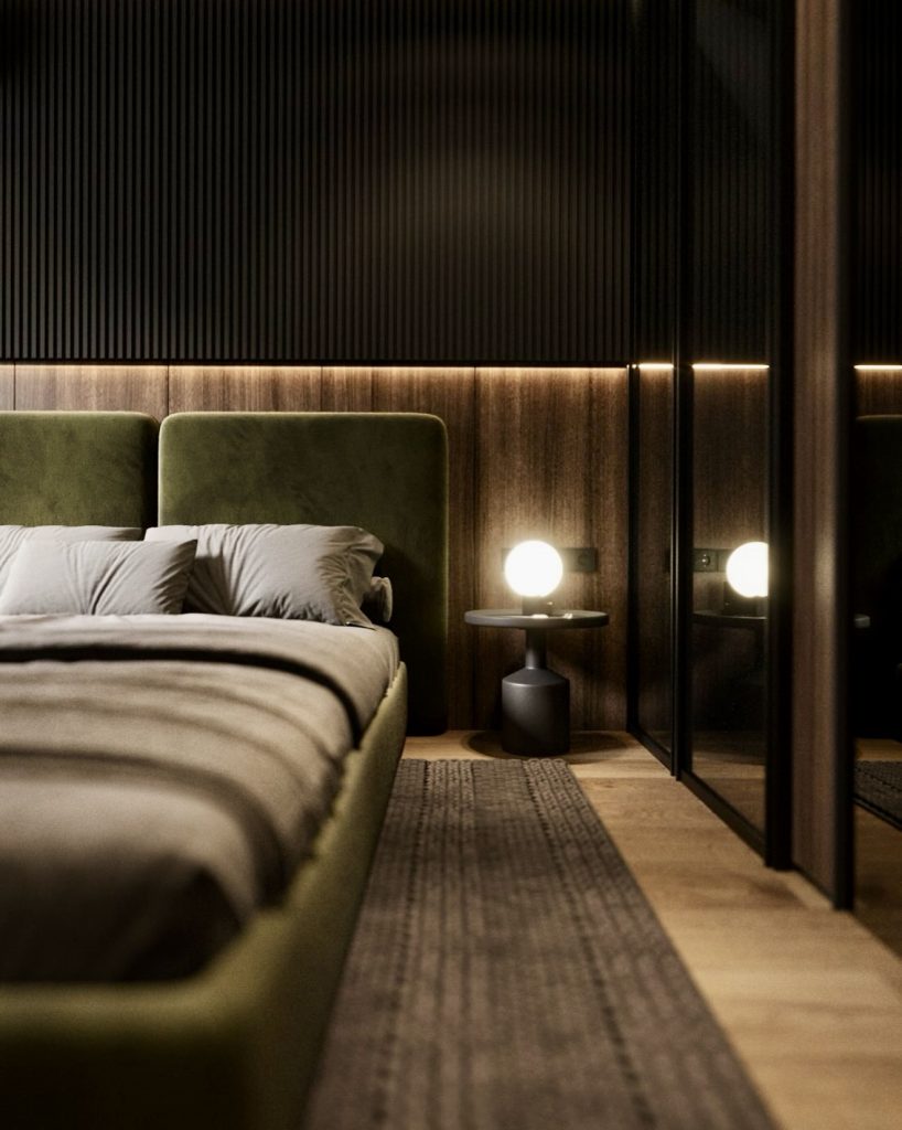 This bedroom uses a confident mix of dark textures and muted green upholstery to create a richly layered, masculine space that feels both modern and intimate. The ribbed wall paneling adds depth without overwhelming the eye, while the warm wood lighting strip brings a soft glow that instantly elevates the mood of the room. The streamlined nightstand and sculptural lamp underscore a contemporary aesthetic, making this design ideal for men who appreciate subtle luxury and a bold, refined look that still prioritizes comfort.