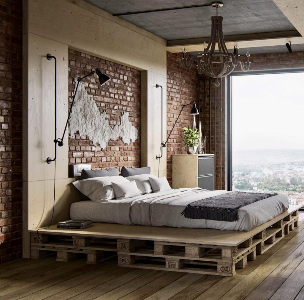 This room channels classic loft living with exposed brick, raw wood platforms, and plenty of character, offering a rugged yet stylish take on modern masculine design. The pallet-style bed frame adds an unexpected, handcrafted feel, while the wall-mounted lamps and oversized chandelier create a dynamic mix of industrial and vintage influences. This setup works particularly well for apartments with large windows or city views, giving the entire space an effortlessly cool, lived-in vibe that feels personal and approachable.