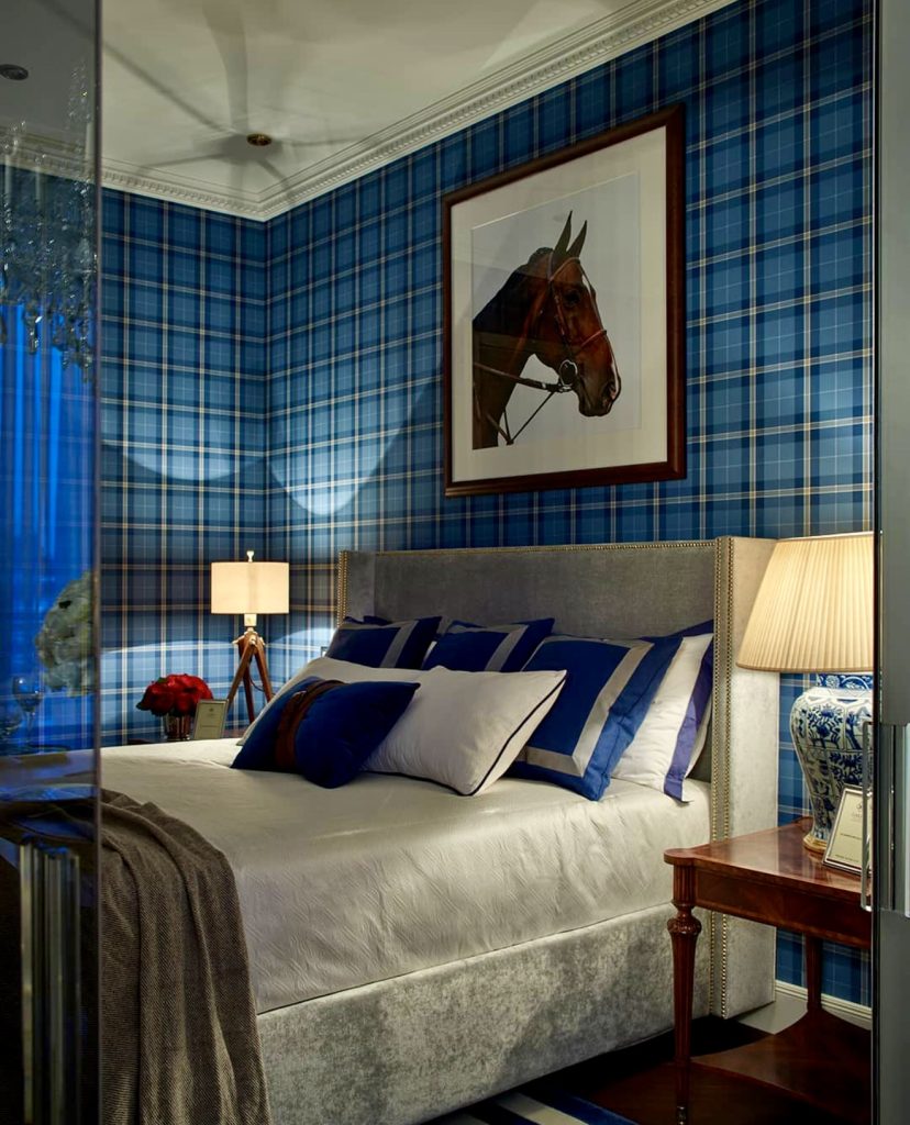 This bedroom embraces a timeless aesthetic with bold plaid walls in deep blue, creating a warm, heritage-inspired environment that feels polished yet inviting. The elegant table lamps, framed equestrian artwork, and crisp bedding give the room a refined charm that’s perfect for men who gravitate toward traditional interiors with a modern edge. The layered textiles and rich color palette make this space feel cozy and tailored, blending classic style with contemporary comfort in a way that never feels outdated.