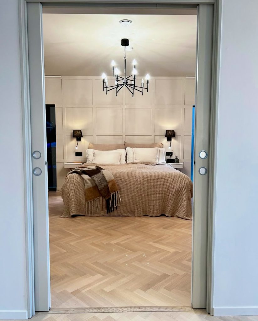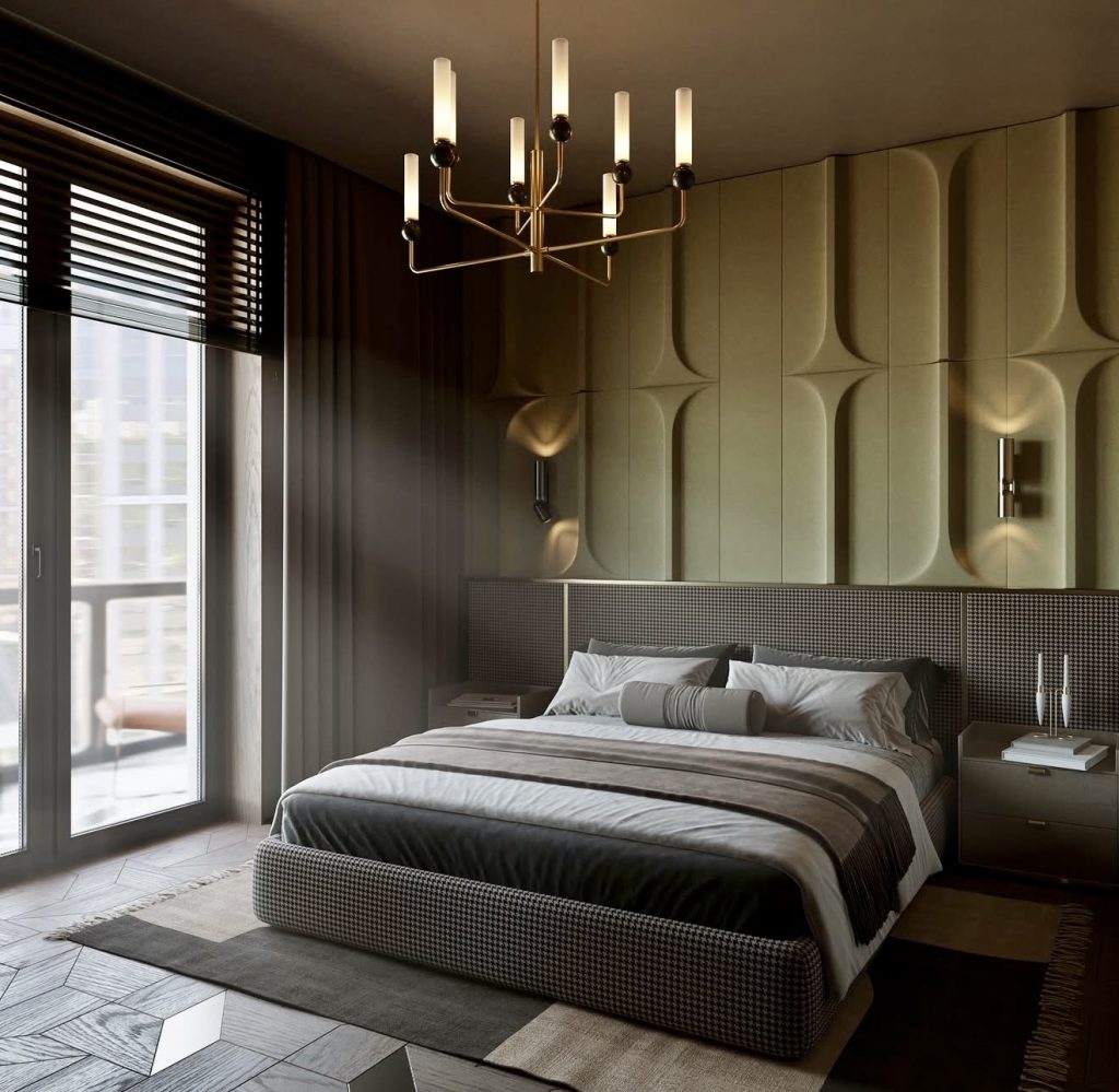 This bedroom leans into structured design with its paneled wall and balanced symmetry, offering men a clean, upscale look without feeling sterile. The warm camel bedding adds an inviting element that pairs beautifully with the geometric chandelier, and the subtle contrast between the walls and flooring adds depth without resorting to heavy dark grey tones. This space is ideal for someone seeking maturity and refinement, especially in a larger home where architectural details can shine. The overall effect is effortlessly masculine and timeless.