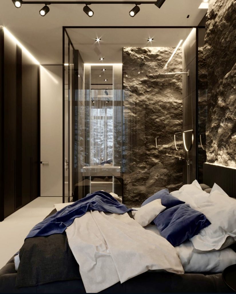 This design makes a dramatic statement with its textured stone backdrop and sleek glass partitions, creating a boldly modern atmosphere that feels luxurious and immersive. The combination of rugged stone, smooth surfaces, and rich blue accents forms a striking contrast that’s ideal for men who appreciate high-impact design. The minimal furnishings keep the focus on the natural materials, making this bedroom feel like a private retreat with a refined edge—a perfect blend of aesthetic detail and masculine energy.