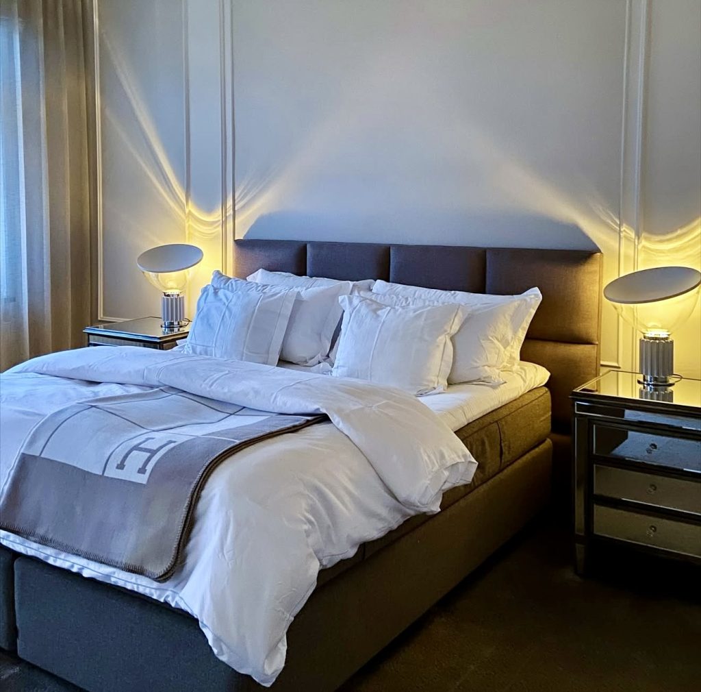 Perfect for men who like a sophisticated and calm design for their personal space, this bedroom adds a quiet and grounded atmosphere with the layered soft static greys and layered fabrics. For this layered look, smooth textures in the bedding and dimmers for the elegant layered lights are used. The balance in the bedroom design creates a feeling of warming touch with contemporary calming minimalism, where the design has thematic unity with softness and sophistication. This shows that minimalism doesn’t have to feel like an absence of design; in this bedroom the design effort is present and is timeless.