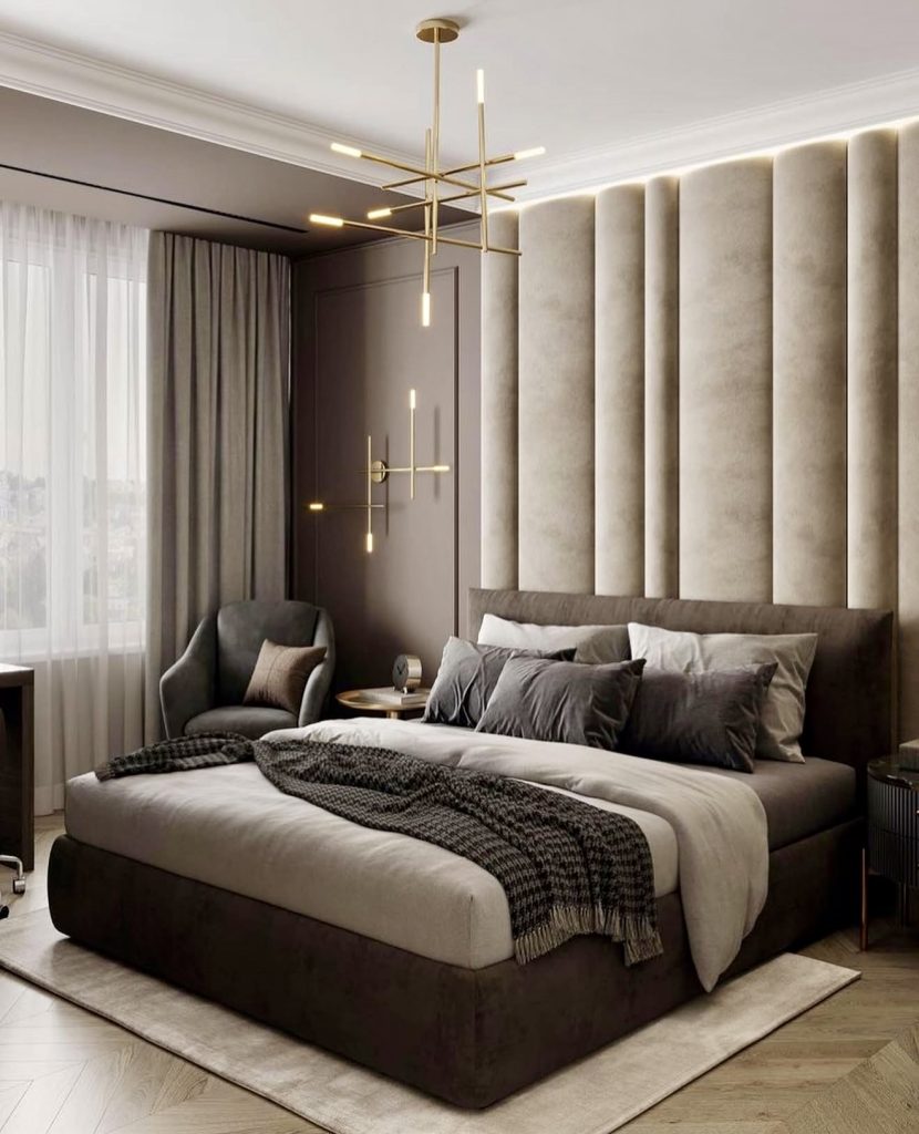This bedroom design features a rich, textured, and sculptural taupe palette. This design is ideal for men that like the neutral dark palette. The tall panels, along with the gold light fixtures and layered bedding, add a hint of modern neutral design. This bedroom works for men who like a more structured, moody neutral design that isn’t compromising on comfort.