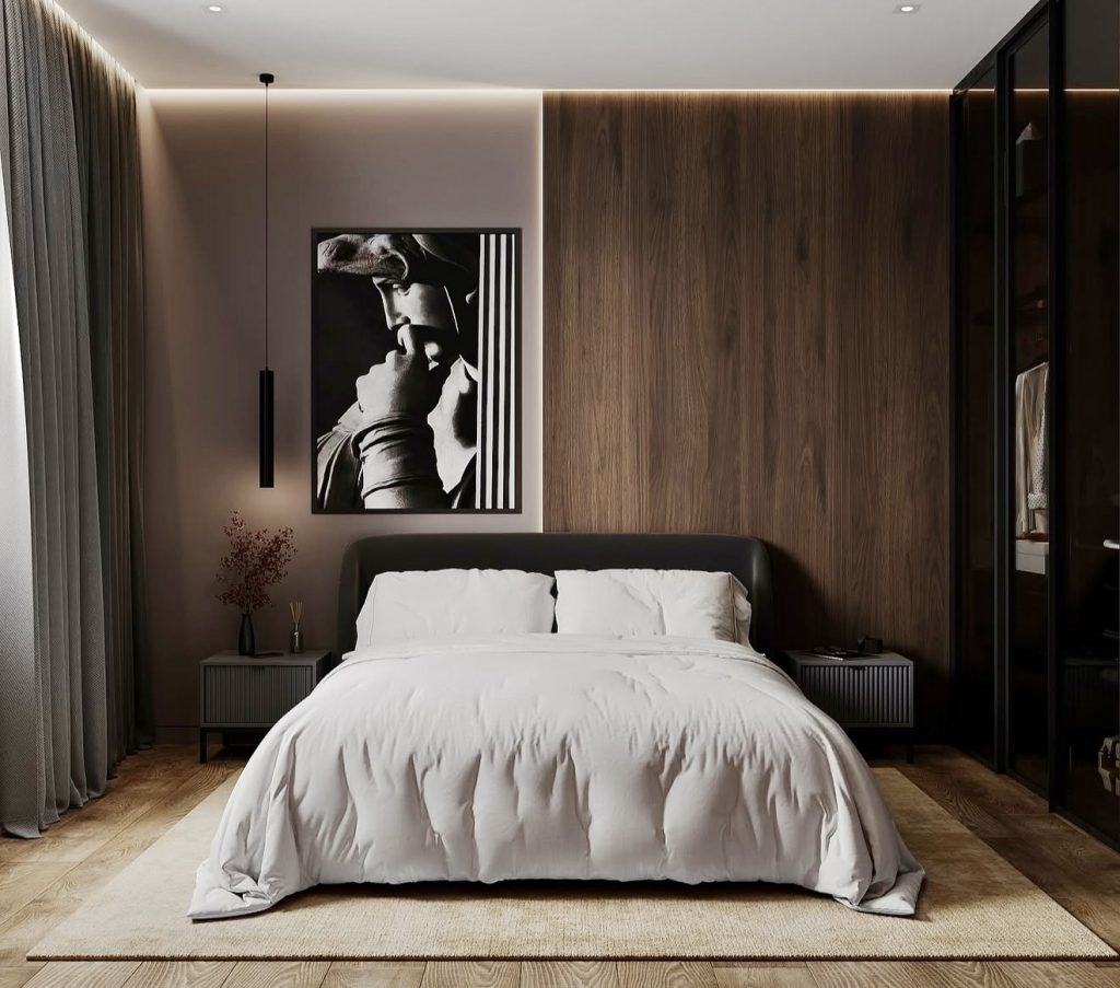 This bedroom is designed as a warm modern retreat by balancing rich wooden paneling with contemporary lighting and a bold piece of artwork and is hence a space perfect for someone who wants a masculine touch without the room being too dark. Soft bedding makes the room feel more inviting and approachable, with an added touch of structure and warmth through the wall-to-wall wooden planking.