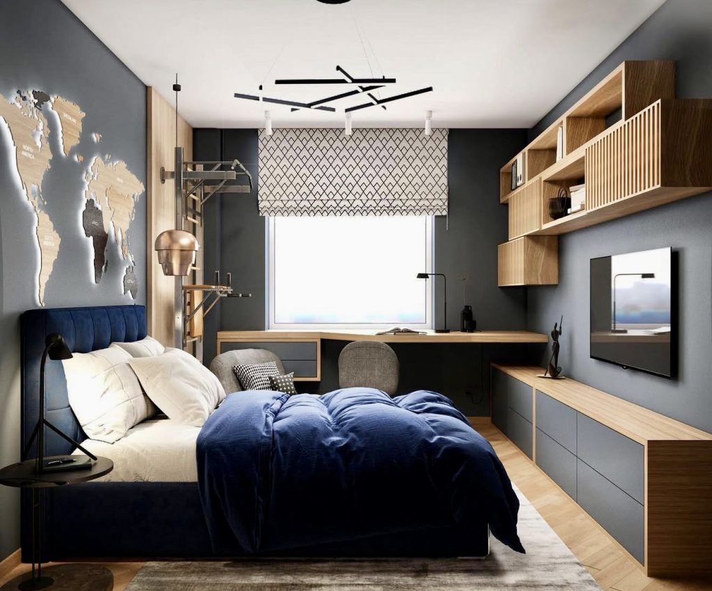 This bold bedroom construction with blue and grey tones, with generous wood storage, design offers a fusion of youthful and sleek. The grey and navy bedding is the perfect addition. The built-in shelves and desk in the corner provide added functionality, perfect for small rooms or compact apartments. The world map on the wall offers minimal style while providing for a sentimental, adventurous feel. This is ideal for males who are looking for style, organization, and a sleek adventurous work zone.