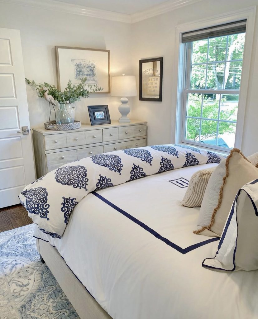 A crisp blend of white and navy creates a classic yet cozy retreat perfect for a guest room or master bedroom. The simple framed posters and shelves above the dresser add just enough visual inspiration without overwhelming the serene palette. Soft patterns and tailored linens give the room a coastal feel—think coastal granddaughter charm meets timeless sophistication. It’s a gentle reminder that neutral tones paired with smart design ideas can make even the smallest apartment feel airy and intentional.