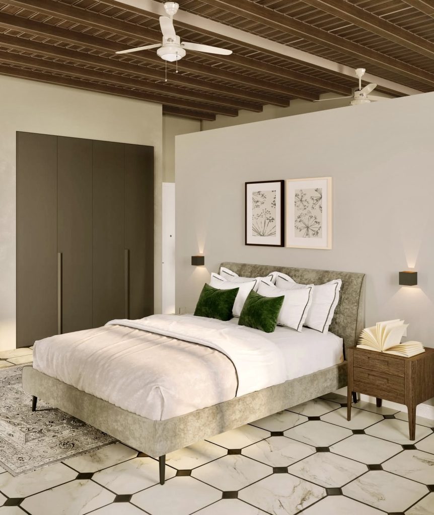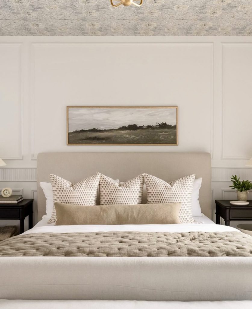 Here’s a lesson in modern restraint and harmony. Clean lines, muted tones, and two framed botanical painting ideas on canvas pieces create a perfectly symmetrical look. Pops of emerald green on the pillows breathe life into the otherwise minimalist neutral color scheme. It’s the kind of modern aesthetic that merges natural warmth with polished design—ideal for those who love subtle elegance and long-lasting inspiration in their master bedroom.