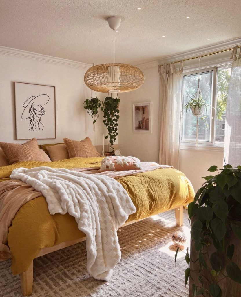 This sunlit retreat embodies effortless aesthetic comfort with warm golden tones and soft natural light. The framed line art above the bed adds a minimalist charm that feels both personal and sophisticated. Draped fabrics, greenery, and soft layering create an irresistibly cozy mood perfect for mornings or lazy afternoons. For anyone seeking DIY ideas to update their space, combining neutral walls with textured linens in mustard or honey shades delivers instant warmth and character—a look that’s as inviting as it is stylish.