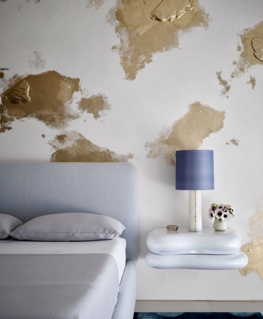 This space is pure inspiration for lovers of modern art-driven design. The abstract gold accents across the wall mimic a painting idea on canvas, transforming the bedroom into a gallery-like sanctuary. Paired with a soft gray bed and sculptural furniture, it achieves the perfect aesthetic balance of luxury and restraint. The result is bold yet harmonious—a reminder that even a minimalist room can exude richness when texture and artistry share the spotlight.