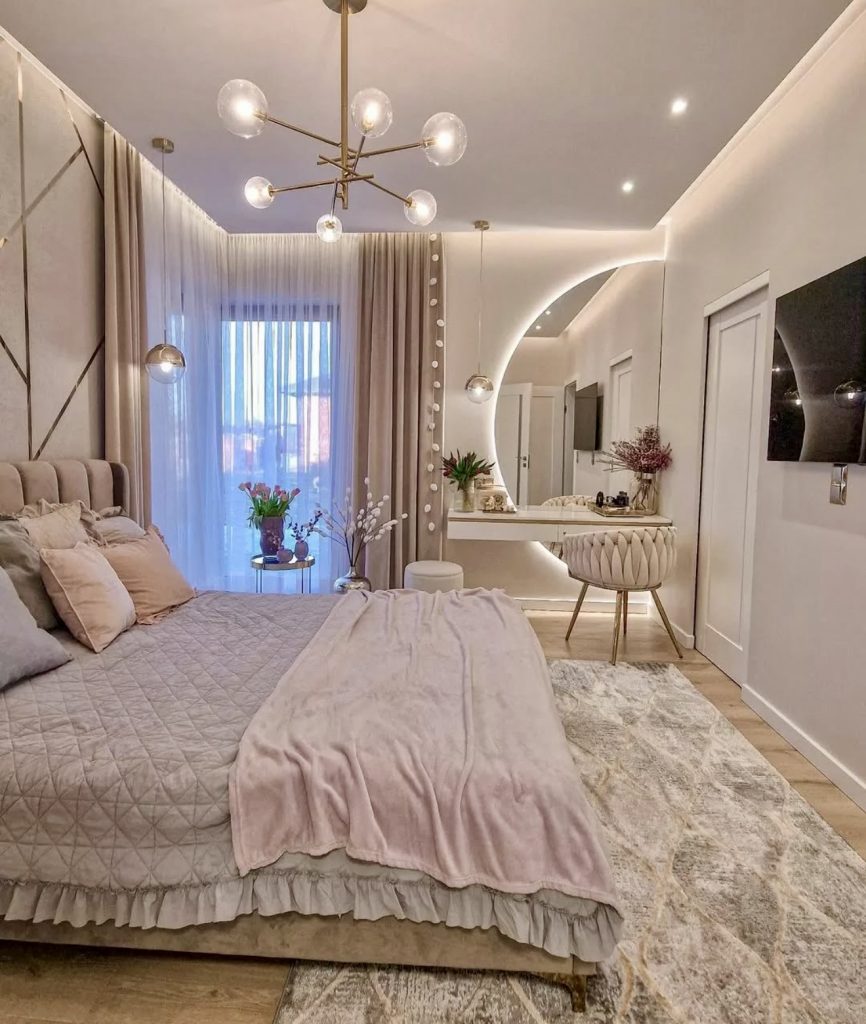 Here’s one for those who adore ideas above bed photos that radiate contemporary inspo. Blush tones, geometric lighting, and a perfectly styled vanity area come together to create a space that feels indulgent yet approachable. The illuminated mirror wall acts as functional decor, giving this apartment bedroom a boutique-hotel vibe. Every element—from the layered curtains to the metallic accents—whispers luxury and makes the room feel intentionally designed for rest and beauty.