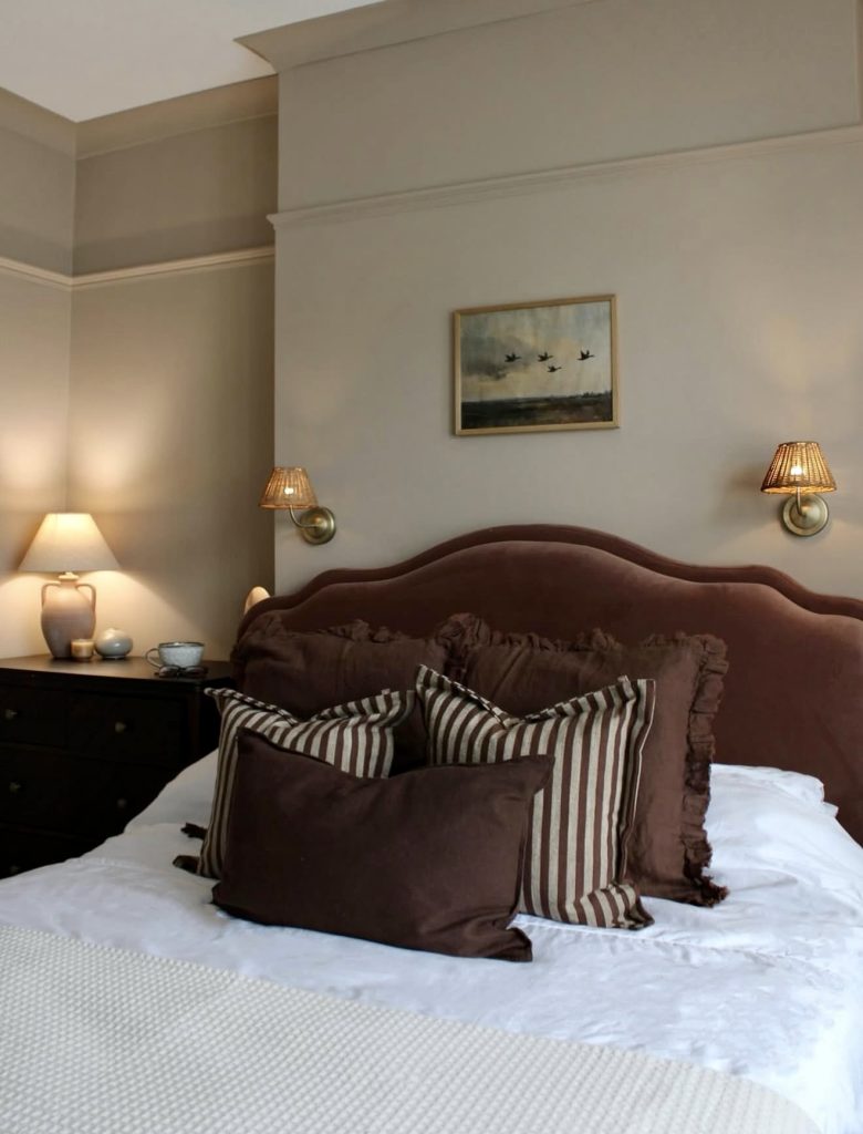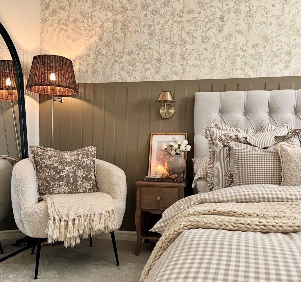 Traditional yet timeless, this design brings together pattern and symmetry with effortless ease. The trio of botanical posters above the bed ties the look together, offering ideas, handmade charm, and soft inspiration for cottage-style interiors. Checked bedding, brass sconces, and light wood furniture evoke the spirit of a cozy countryside guest room while keeping things clean and inviting. It’s the perfect mix of aesthetic nostalgia and modern design—exactly what makes bedroom wall decor 2026 so relevant today.