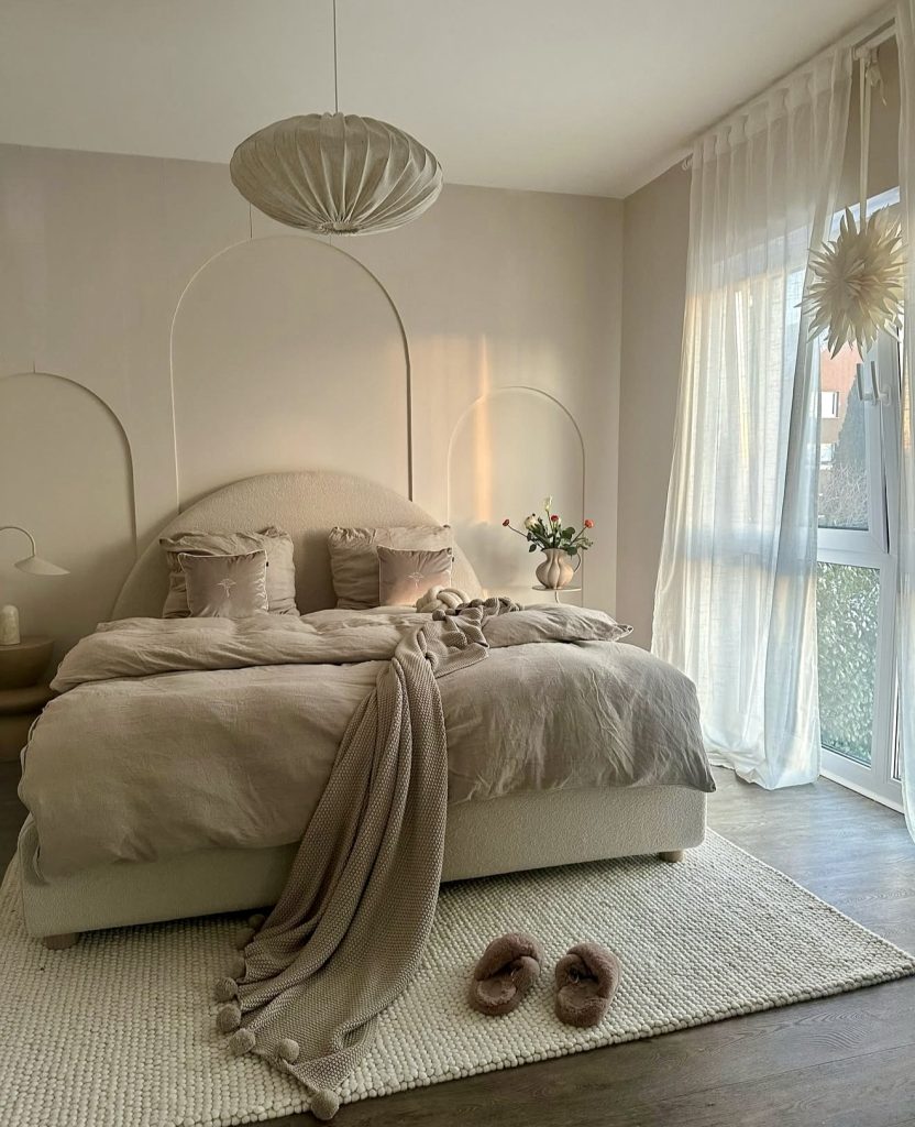 This space embodies aesthetic minimalism with layered neutrals and soothing texture. The arched wallpapers for rooms behind the bed add architectural interest, making the wall itself art. It’s beautiful inspo for those who love DIY ideas that bring calm elegance to modern homes. Natural light, flowing curtains, and plush bedding create warm, cozy energy perfect for winding down after long days—proof that a muted neutral palette never feels boring when texture and light take center stage.