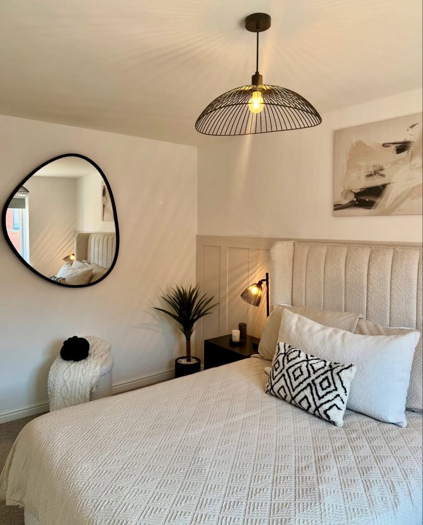 A refined approach to bedroom wall decor in 2026, this minimalist design thrives on contrast and geometry. The asymmetrical mirror, abstract poster, and black pendant lighting define the modern aesthetic, while soft white bedding keeps the mood tranquil and cozy. The look feels both urban and timeless—ideal for those who enjoy inspiration rooted in simplicity. It’s a style that proves how a few well-chosen DIY ideas can instantly elevate a room into a statement of effortless taste.