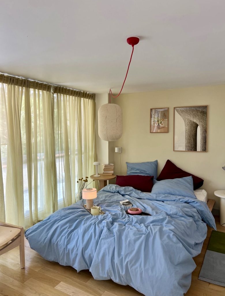 This joyous room balances soft light and bold accents, creating a striking yet cozy atmosphere. The bedding in sky blue is a lovely contrast to the garnet, warm wood accents, and the posters framed and hung over the bed. Slightly eclectic is the relaxed modern design, and that is with thoughtful inspiration and vibrant personality. For those that adore DIY with cheerful color contrasts and a minimalist design, this style will transform modern living into a more intentional and joyful everyday life.