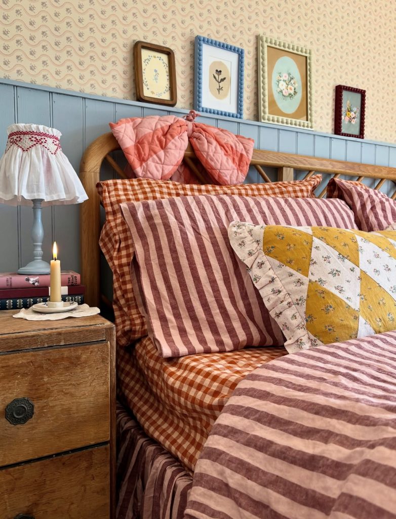 Bursting with color, pattern, and personality, this cottage-inspired room conceptualizes handmade vintage charm. Framed posters and small artworks above the bed narrate the story, and the checkered bedding along with floral prints add joyful layers. This is a perfect reflection of coastal granddaughter energy: playful, nostalgic, and creative. Every detail feels curated, yet relaxed, for a reminder that inspiration often lies in the embrace of imperfections and the confident, eclectic mixing of eras.