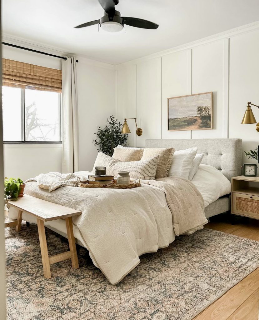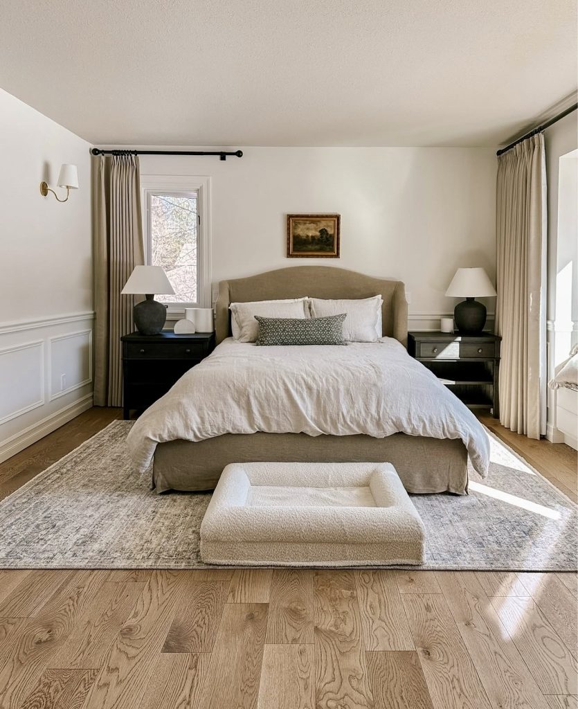 Subtle sophistication, as seen in this master bedroom, is lightly expressed. There is effortless polish in the soft beige tones, whites with the bedding, and structured symmetry. It is cozy and warm and beautiful while remaining timeless; a true reflection of the decorative calm and 2026 wall inspiration balance that is quiet and seamless. This design offers a perfect neutral palette to unwind and recharge for a sanctuary-like retreat.