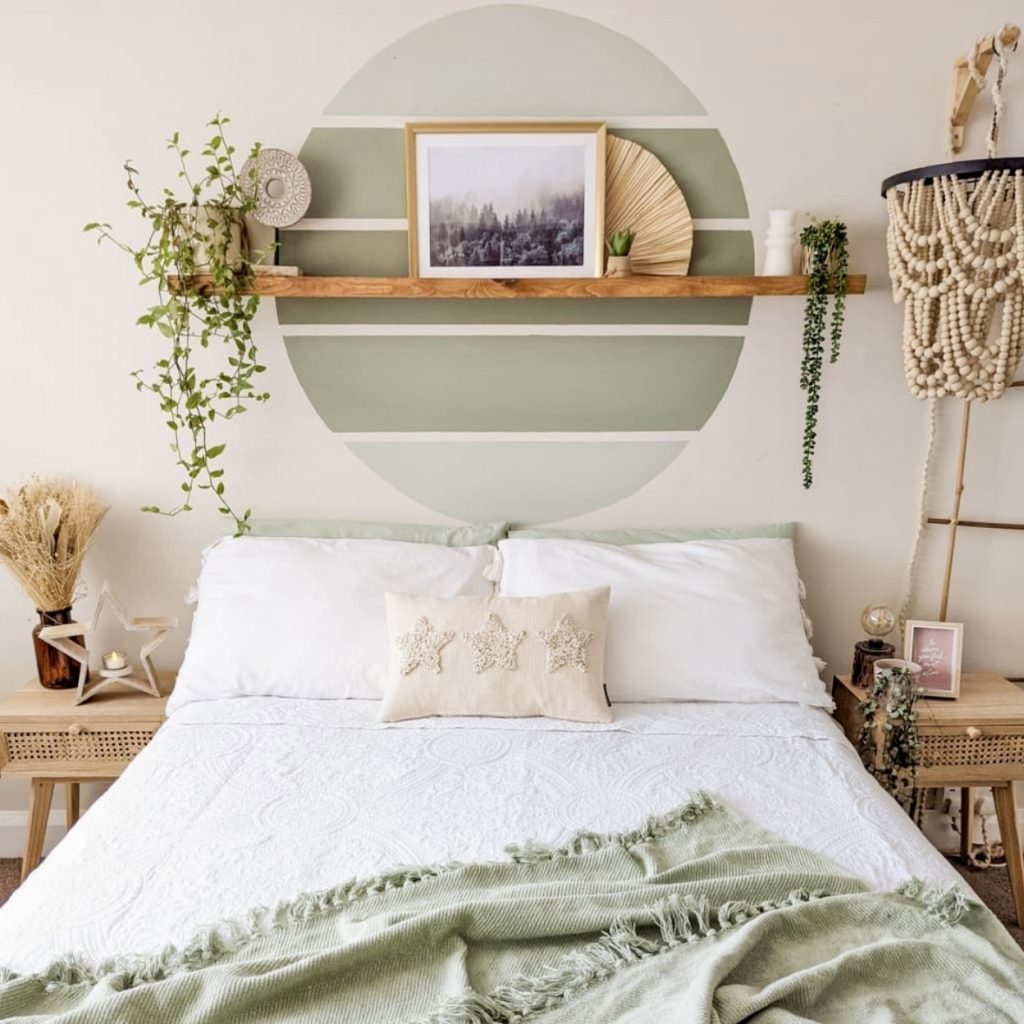 A creative, youthful space filled with handmade ideas and refreshing green tones. The circle geometric design behind the bed works as a piece of contemporary wall art, along with a narrow shelf holding decorative pieces and plants. This room captures DIY and coastal ideas—light, playful, and close to nature. It’s a wonderful example of how painting ideas on canvas can extend to the wall. The subtle contrast of whites with the bedding and soft greens makes it a joyful and inspo-driven choice for a striking and quick room makeover.