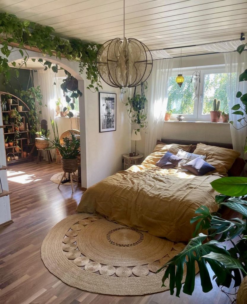 7. Green Sanctuary with Boho Warmth
