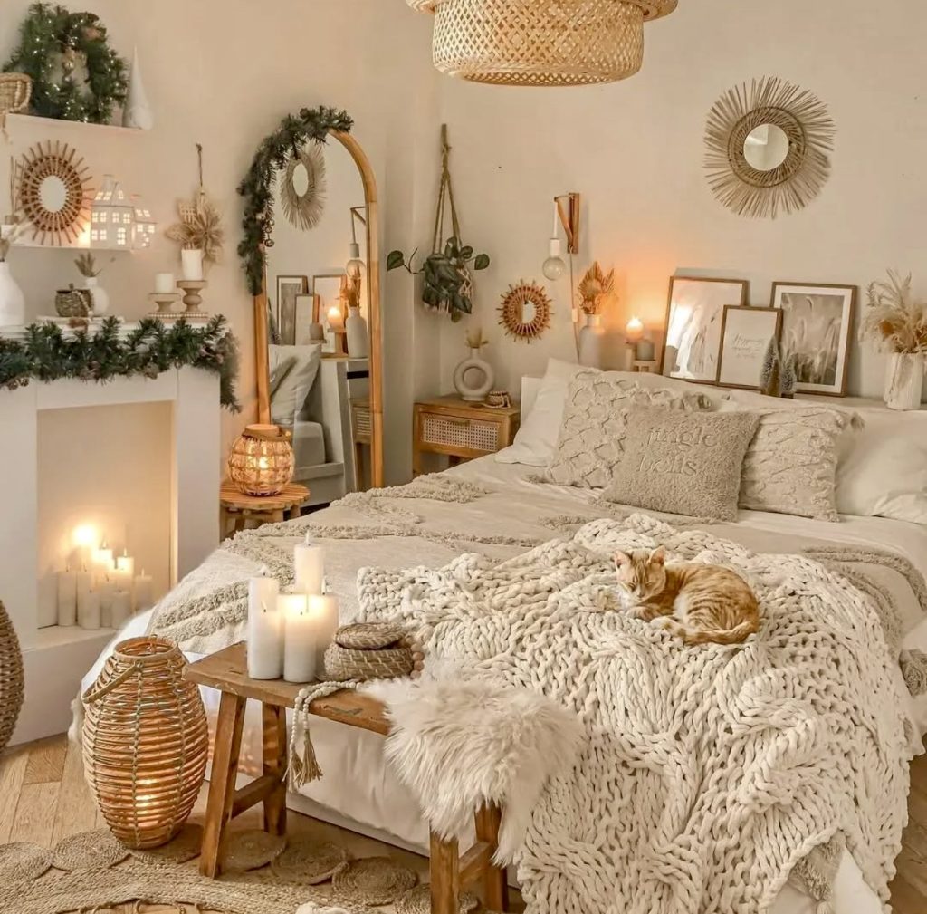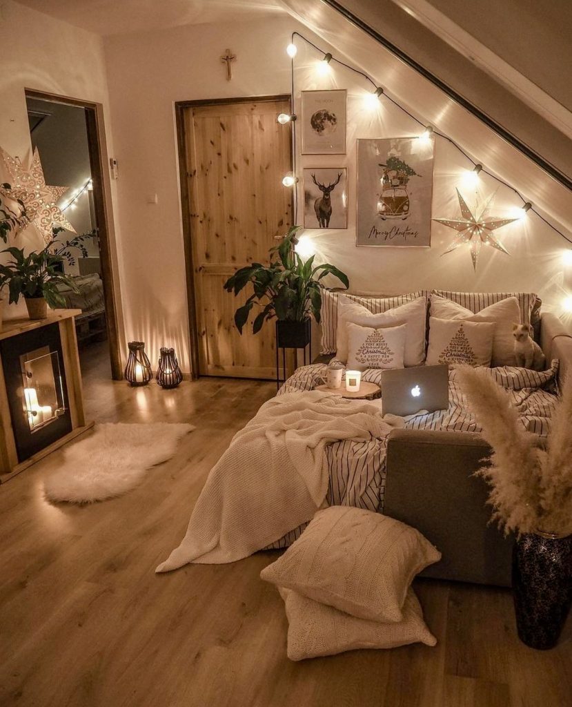 A perfect example of ideas DIY meeting ambiance, this room glows with layered lighting and warm wooden accents. String lights, candles, and framed posters fill the wall with depth and personality, transforming this small attic apartment into a cozy, cinematic haven. There’s a clear aesthetic balance between rustic and festive—soft textiles, white tones, and a hint of holiday charm make it ideal for anyone craving comfort and inspiration on a winter night.