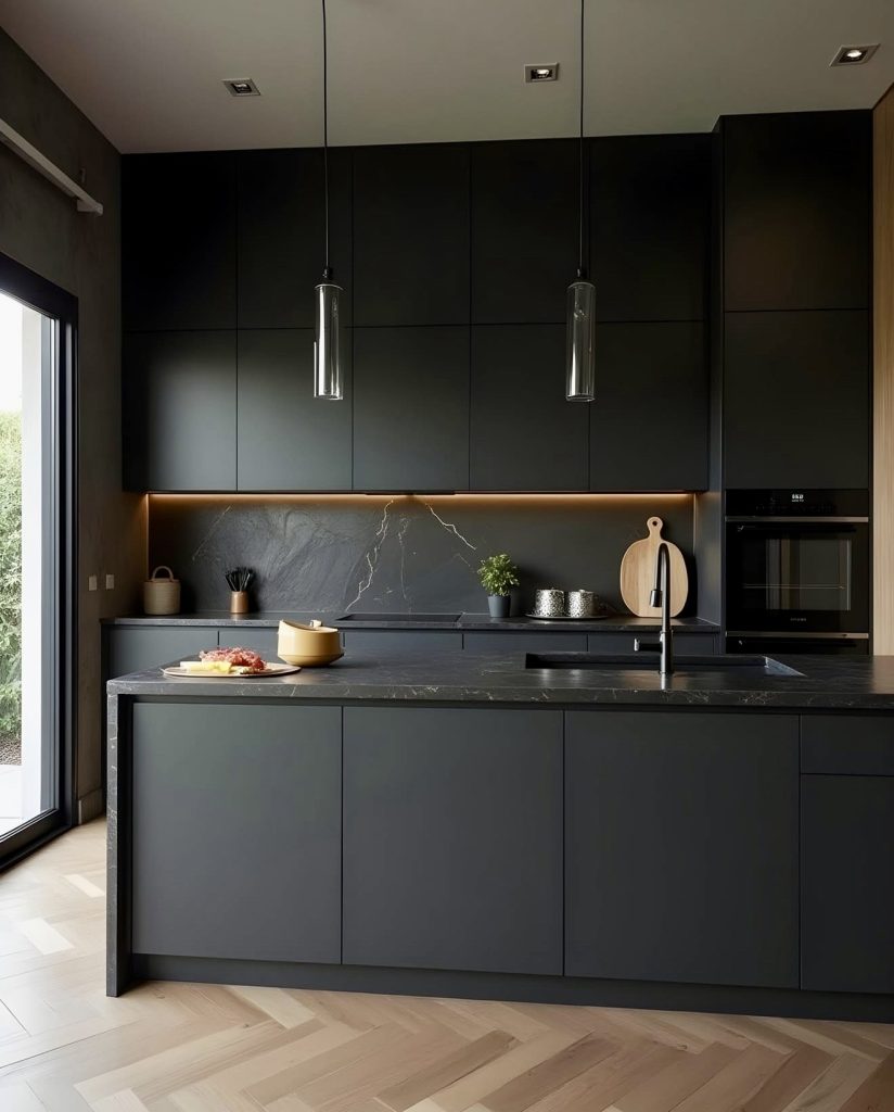 This kitchen embodies the essence of modern restraint with its full-height matte black cabinets, integrated appliances, and a striking waterfall island that grounds the room. The dark stone surfaces reinforce a sense of quiet luxury, while the warm under-cabinet glow softens the bold palette without competing with the sculptural pendants. Light herringbone flooring adds subtle contrast and keeps the look approachable, proving that even an all-black space can feel balanced when paired with soft neutrals and clean architectural lines.