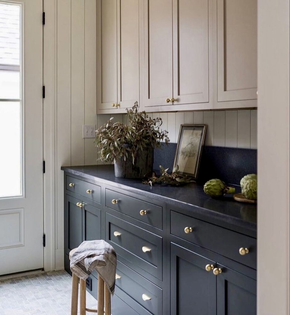 This space demonstrates how contrast can be used to create a soft, inviting interpretation of the black-kitchen trend by pairing deep lower cabinets with warm taupe uppers, subtle brass hardware, and a charcoal wood countertop. The muted palette brings in a taupe and black combination that feels fresh for 2026, providing just enough depth without overpowering the room. Soft natural light, panelled walls, and a relaxed styling approach introduce a cozy charm, making this an ideal inspiration point for anyone looking to blend contemporary black accents with a lived-in farmhouse flavor.
