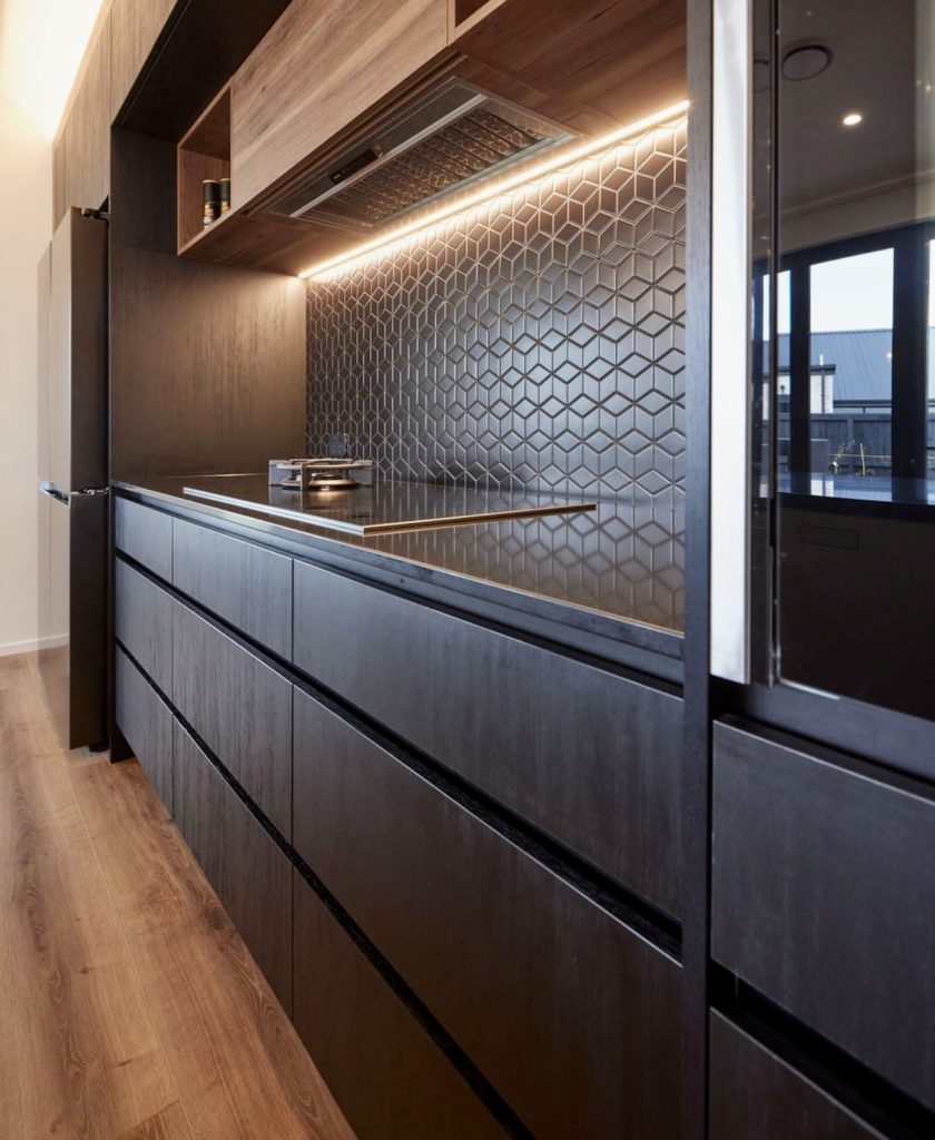 This kitchen embraces a sleek, architectural spirit with its matte black drawers paired with a geometric hex-tile backsplash that adds depth and shadow play to the wall. Warm overhead lighting highlights the pattern, making it a strong focal point that feels both contemporary and inviting. The pairing of black cabinetry with rich natural wood introduces an earthy balance, showing how wood and modern finishes can coexist beautifully. It’s a refined, forward-thinking design approach perfect for those looking to elevate a compact cooking zone without overwhelming the space.