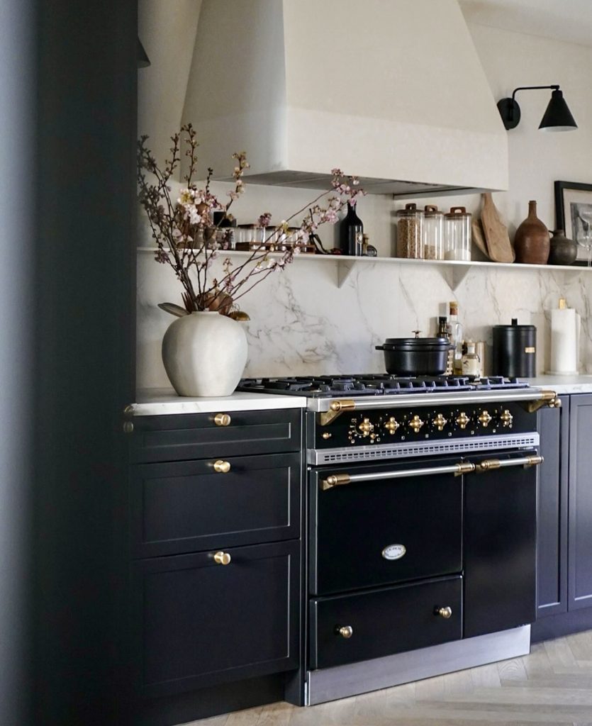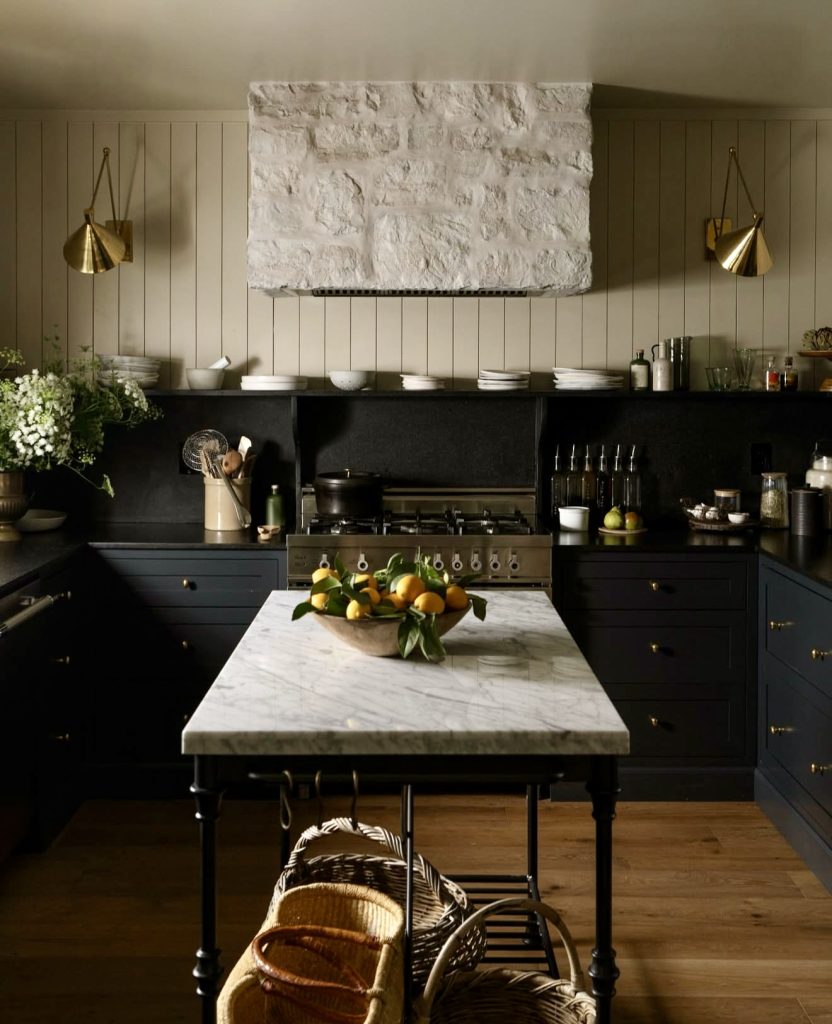 This cozy, character-rich kitchen blends deep black lower cabinetry with a textured stone hood and paneled walls to create a space that feels grounded and timeless. The dark countertops offer contrast against the soft neutrals, while brass fixtures and artisan lighting bring a warm, lived-in aesthetic. The marble-topped island introduces subtle white and veining, lifting the palette just enough to keep it airy. This look—often highlighted by heritage-style designers—proves that black cabinetry can coexist effortlessly with rustic elements for homeowners who love a layered, soulful environment.